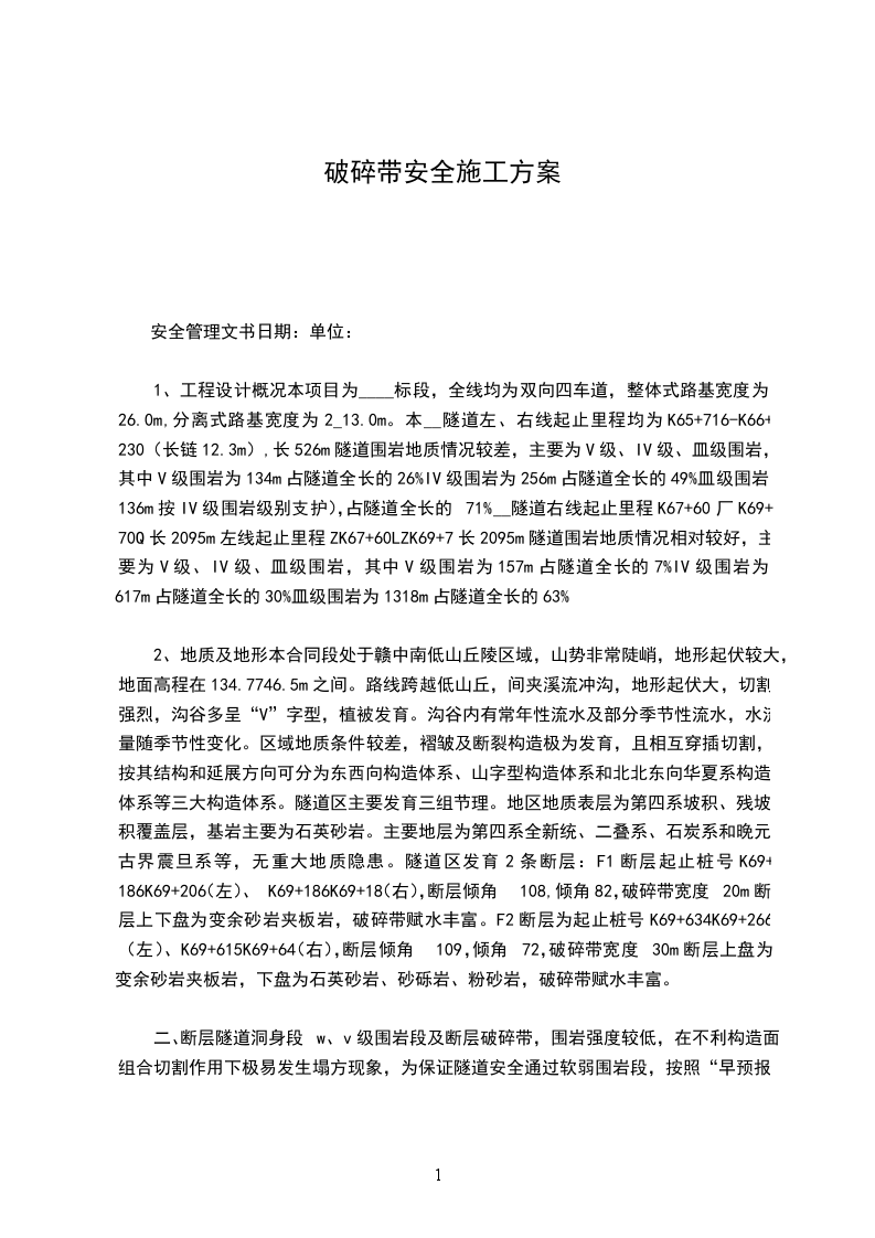2、地质及地形本合同段处于赣中南低山丘陵区域,山势非常陡峭,地形起伏较大,地面高程在134.7746.5m之间。路线跨越低山丘,间夹溪流冲沟,地形起伏大,切割强烈,沟谷多呈“V”字型,植被发育。沟谷内有常年性流水及部分季节性流水,水流量随季节性变化。区域地质条件较差,褶皱及断裂构造极为发育,且相互穿插切割,按其结构和延展方向可分为东西向构造体系、山字型构造体系和北北东向华夏系构造体系等三大构造体系。隧道区主要发育三组节理。地区地质表层为第四系坡积、残坡积覆盖层,基岩主要为石英砂岩。主要地层为第四系全新统、二叠系、石炭系和晚元古界震旦系等,无重大地质隐患。隧道区发育2条断层:F1断层起止桩号K69+186K69+206(左)、K69+186K69+18(右),断层倾角108,倾角82,破碎带宽度20m断层上下盘为变余砂岩夹板岩,破碎带赋水丰富。F2断层为起止桩号K69+634K69+266(左)、K69+615K69+64(右),断层倾角109,倾角72,破碎带宽度30m断层上盘为变余砂岩夹板岩,下盘为石英砂岩、砂砾岩、粉砂岩,破碎带赋水丰富。