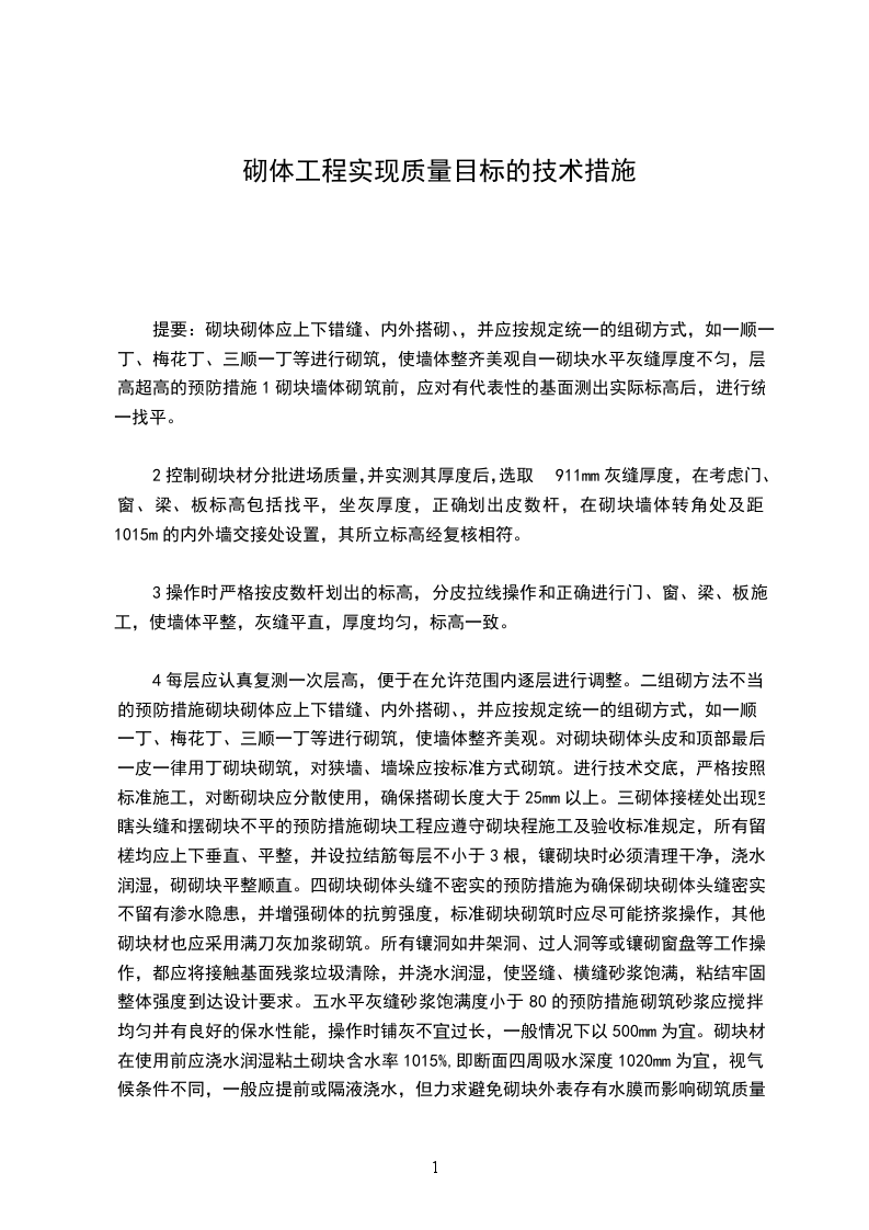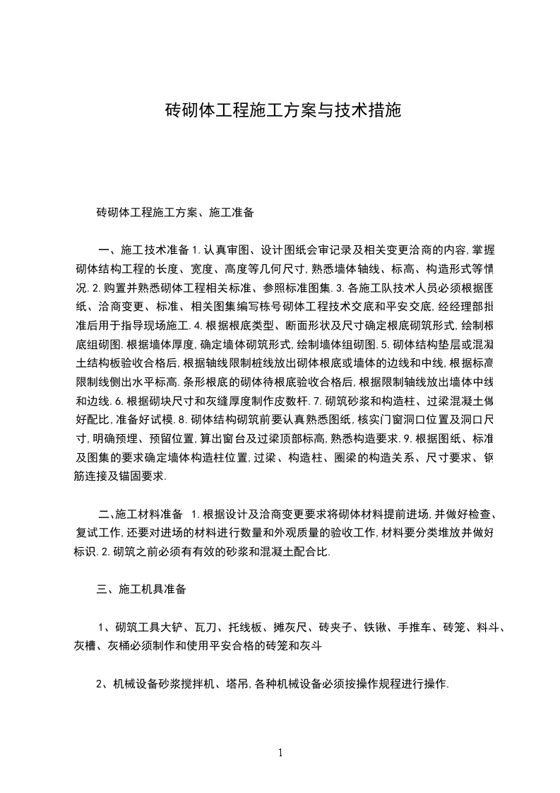 一、施工技术准备1.认真审图、设计图纸会审记录及相关变更洽商的内容,掌握砌体结构工程的长度、宽度、高度等几何尺寸,熟悉墙体轴线、标高、构造形式等情况.2.购置并熟悉砌体工程相关标准、参照标准图集.3.各施工队技术人员必须根据图纸、洽商变更、标准、相关图集编写栋号砌体工程技术交底和平安交底,经经理部批准后用于指导现场施工.4.根据根底类型、断面形状及尺寸确定根底砌筑形式,绘制根底组砌图.根据墙体厚度,确定墙体砌筑形式,绘制墙体组砌图.5.砌体结构垫层或混凝土结构板验收合格后,根据轴线限制桩线放出砌体根底或墙体的边线和中线,根据标高限制线侧出水平标高.条形根底的砌体待根底验收合格后,根据限制轴线放出墙体中线和边线.6.根据砌块尺寸和灰缝厚度制作皮数杆.7.砌筑砂浆和构造柱、过梁混凝土做好配比,准备好试模.8.砌体结构砌筑前要认真熟悉图纸,核实门窗洞口位置及洞口尺寸,明确预埋、预留位置,算出窗台及过梁顶部标高,熟悉构造要求.9.根据图纸、标准及图集的要求确定墙体构造柱位置,过梁、构造柱、圈梁的构造关系、尺寸要求、钢筋连接及锚固要求.