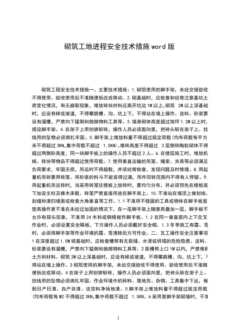 四、平安考前须知1.砌筑工进场之前必须经过身体健康状况检查,参加施工平安教育培训,经测试合格前方可进行施工.2.施工前施工队必须根据本施工交底下达施工平安操作交底.3.在操作之前必须检查操作环境是否符合平安要求,机具是否完好无损,平安设施和防护用品是否齐全,经检查符合要求后才可施工.4.塔吊运输过程中,要随时观察操作面上人员情况,以防砖块等失落伤人.5.操作人员进入施工现场必须戴好合格的平安帽,使用配套的劳动保护用品.6.机械设备用电必须符合“三相五线制及三级保护的规定.7.所使用的机械设备必须平安可靠、性能良好,同时设有限位保险装置.8.醇应轻码轻放,禁止随手抛接,预防伤人,醇在地面上的堆置高度不应超过2m.9.墙身砌筑高度超过1.2m时,应搭设脚手架,在一层以上或高度超过4m时,采用里脚手架必须沿房屋四周支搭平安网;用外脚手架,除沿房屋四周设置平安网外,还应设护身栏杆和挡脚板,并随施工高度逐层增高,屋面工程未完不得撤除.10.脚手架上堆放料量不得超过规定荷载,堆砖高度不得超过3皮砖,同一块脚手板上的操作人员不应超过2人.11.在楼层施工时,堆放机具、砖块等物品不得超过楼板的设计允许荷载结构施工总说明中有规定,现场施工活荷载必须乘以1.4的系数.12.不准用不稳固的工具或物体在脚手板面垫高操作,更不准在未经加固的情况下,在一层脚手架上随意叠加一层.13.使用于垂直运输的吊笼、绳索、刹车等,必须满足荷载要求,牢固无损,吊运时不得超载,并经常检查,发现问题及时进行修理.14.吊运砖块必须使用铁笼和托板集中装吊,吊装就位后应待砖块放稳后才能松开吊具,吊具应于班前检查,如有破损和变形严禁使用.15.吊运科或砂浆时,吊车司机应与