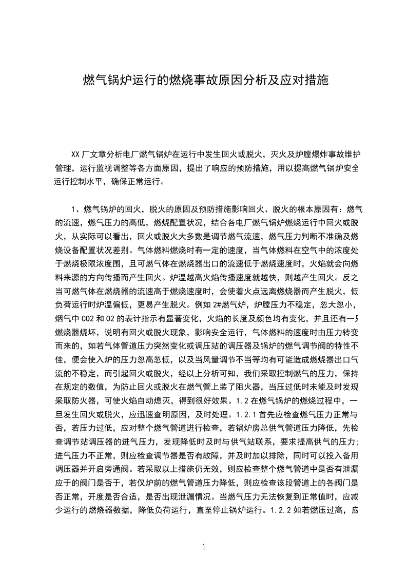 1、燃气锅炉的回火,脱火的原因及预防措施影响回火、脱火的根本原因有:燃气的流速,燃气压力的高低,燃烧配置状况,结合各电厂燃气锅炉燃烧运行中回火或脱火,从实际可以看出,回火或脱火大多数是调节燃气流速,燃气压力判断不准确及燃烧设备配置状况差别。气体燃料燃烧时有一定的速度,当气体燃料在空气中的浓度处于燃烧极限浓度围,且可燃气体在燃烧器出口的流速低于燃烧速度时,火焰就会向燃料来源的方向传播而产生回火。炉温越高火焰传播速度就越快,则越产生回火。反之,当可燃气体在燃烧器的流速高于燃烧速度时,会使着火点远离燃烧器而产生脱火,低负荷运行时炉温偏低,更易产生脱火。例如2#燃气炉,炉膛压力不稳定,忽大忽小,烟气中CO2和O2的表计指示有显著变化,火焰的长度及颜色均有变化,并且还有一只燃烧器烧坏,说明有回火或脱火现象,影响安全运行,气体燃料的速度时由压力转变而来的,如若气体管道压力突然变化或调压站的调压器及锅炉的燃气调节阀的特性不佳,便会使入炉的压力忽高忽低,以及当风量调节不当等均有可能造成燃烧器出口气流的不稳定,而引起回火或脱火,经以上分析可知,我们采取控制燃气的压力,保持在规定的数值,为防止回火或脱火在燃气管上装了阻火器,当压过低时未能及时发现,采取防火器,可使火焰自动熄灭,得到很好效果。1.2在燃气锅炉的燃烧过程中,一旦发生回火或脱火,应迅速查明原因,及时处理。1.2.1首先应检查燃气压力正常与否,若压力过低,应对整个燃气管道进行检查,若锅炉房总供气管道压力降低,先检查调节站调压器的进气压力,发现降低时及时与供气站联系,要求提高供气的压力;进气压力不正常,则应检查调节器是否有故障,并及时加以排除,同时可以投入备用调压器并开启旁通阀。若采取以上措施仍无效,则应检查整个燃气管道中是否有泄漏,应于的阀门是否于,若仅炉前的燃气管道压力降低,则应检查该段管道上的各阀门是否正常,开度是否合适,是否出现泄漏情况。当燃气压力无法恢复到正常值时,应减少运行的燃烧器数据,降低负荷运行,直至停止锅炉运行。1.2.2如若燃压过高,应分段检查整个燃气管道上的各调节阀是否正常,其次检查个燃烧器的风门开度是否合适,检查风道上的总风压和燃烧器前风压是否偏高等,并作出相应的调整。