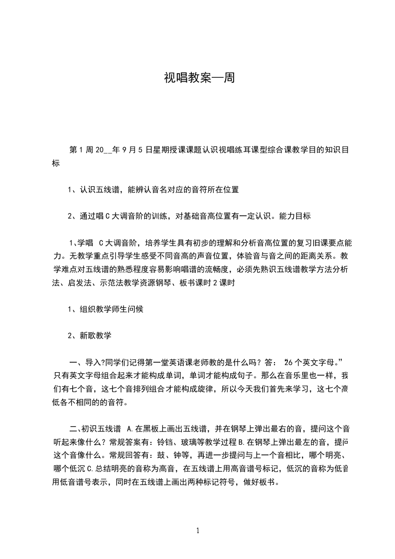 第1周20__年9月5日星期授课课题认识视唱练耳课型综合课教学目的知识目标