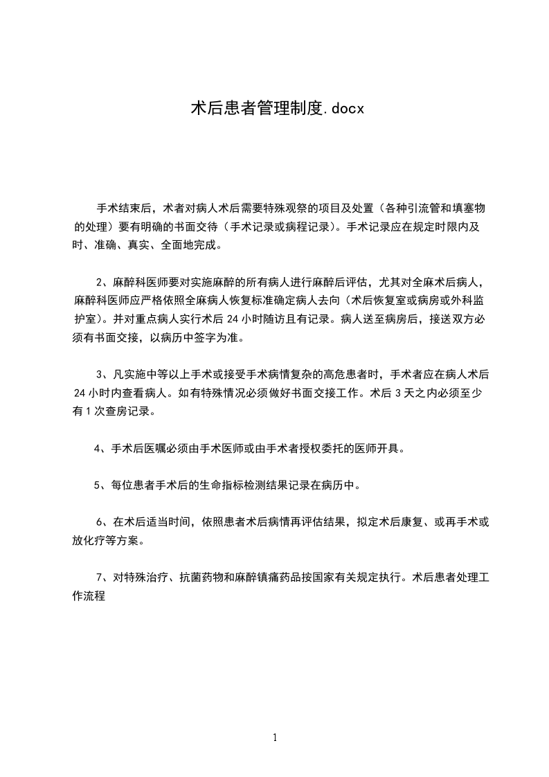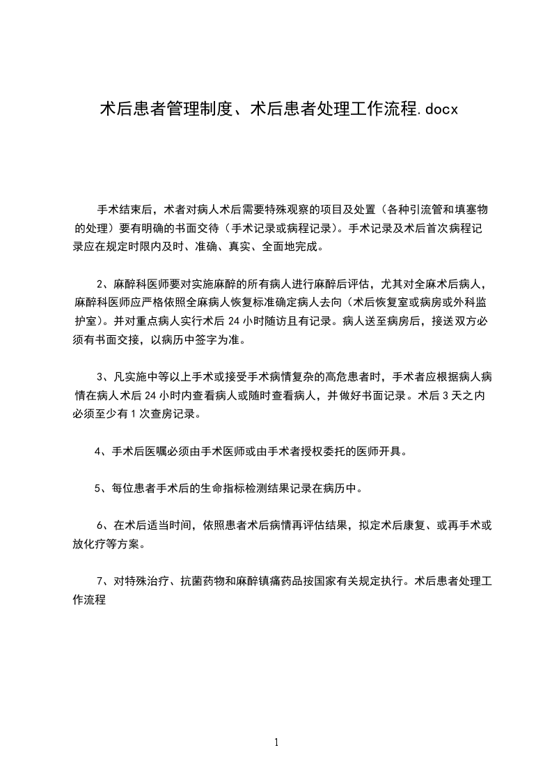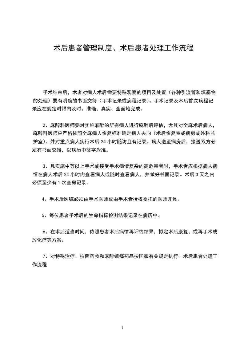 7、对特殊治疗、抗菌药物和麻醉镇痛药品按国家有关规定执行。术后患者处理工作流程
