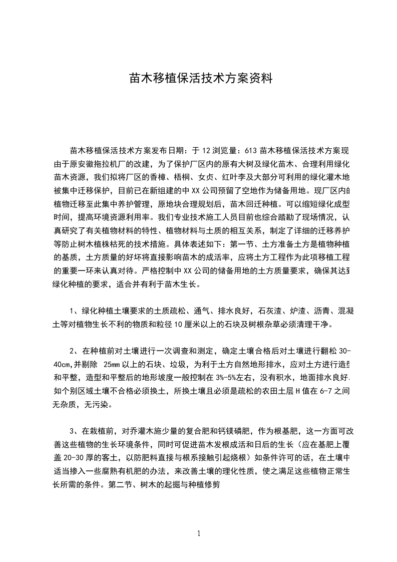 苗木移植保活技术方案发布日期:于12浏览量:613苗木移植保活技术方案现由于原安徽拖拉机厂的改建,为了保护厂区内的原有大树及绿化苗木、合理利用绿化苗木资源,我们拟将厂区的香樟、梧桐、女贞、红叶李及大部分可利用的绿化灌木地被集中迁移保护,目前已在新组建的中XX公司预留了空地作为储备用地。现厂区内的植物迁移至此集中养护管理,原地块合理规划后,苗木回迁种植。可以缩短绿化成型时间,提高环境资源利用率。我们专业技术施工人员目前也综合踏勘了现场情况,认真研究了有关植物材料的特性、植物材料与土质的相互关系,制定了详细的迁移养护等防止树木植株枯死的技术措施。具体表述如下:第一节、土方准备土方是植物种植的基质,土方质量的好坏将直接影响苗木的成活率,应将土方工程作为此项移植工程的重要一环来认真对待。严格控制中XX公司的储备用地的土方质量要求,确保其达到绿化种植的要求,适合并有利于苗木生长。