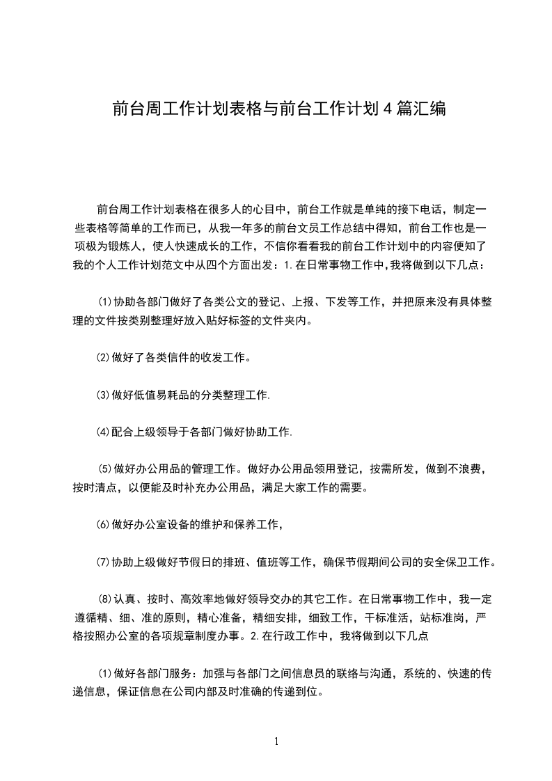 前台周工作计划表格在很多人的心目中,前台工作就是单纯的接下电话,制定一些表格等简单的工作而已,从我一年多的前台文员工作总结中得知,前台工作也是一项极为锻炼人,使人快速成长的工作,不信你看看我的前台工作计划中的内容便知了。我的个人工作计划范文中从四个方面出发:1.在日常事物工作中,我将做到以下几点: