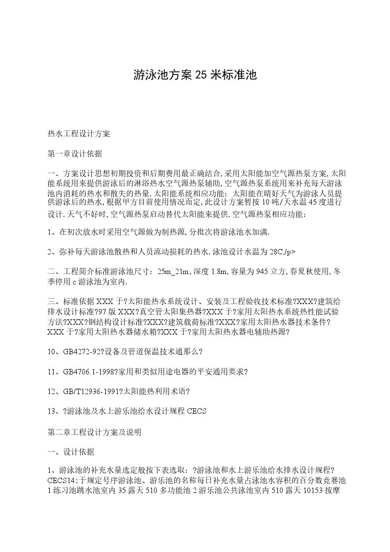 2、当地卫生防疫部门有规定时,应按卫生防疫部门的规定执行.由于此游泳池平时几乎不换水,只是补充游泳的人带走的热水损耗,根据实际使用情况记录数值,补水量按4%值.即:25米的标准游泳池每天需要补充的热水为:945_4%=37.8吨.每天补充的热水总量为:37.8吨