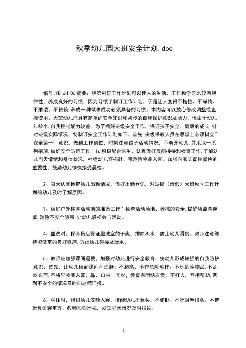 三、其它措施在幼儿园安全工作计划中永远是安全第一。班级保教人员在思想上必须树立“安全第一”意识,做到工作到位,时刻注意孩子活动情况,不离开幼儿,并采取一系列措施,做好安全防范工作。