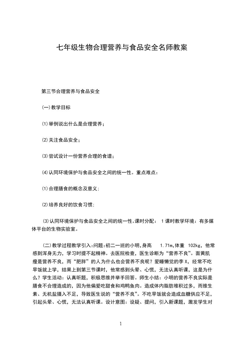 3、搜集有关蛋白质缺乏的奶粉的资料。教学过程:教学环节及时间安排教师活动学生活动设计意图创设情境激趣导入3分钟通过(大屏幕展示一副食物的图片,并配以优美的音乐)刚才出示这些图片中的食物都是我们经常食用的,这些食物来源于生物圈中的动物、植物、微生物。这些食物中含有哪些营养成分?这些营养成分对我们人体有何作用?今天我们就来研究这些问题吧?导入新课。3.1.1食物的营养成分首先来看一下本节课的学习目标:(投影展示:学习目标)学生观看图片,带着问题步入课堂。明确学习目标图片导入,设疑诱思激发学习兴趣。让学生带着问题走入课堂,激发学生的求知欲。启迪思维导学新知18分钟一:食物中的营养成分过渡:民以食为天,食物是人类赖以生存的物质基础,是保障人类身体健康的基本物质。为了维持生命与健康,那么食物中含有哪些营养成分对人体是有益的呢?知识点一:食物中的营养成分