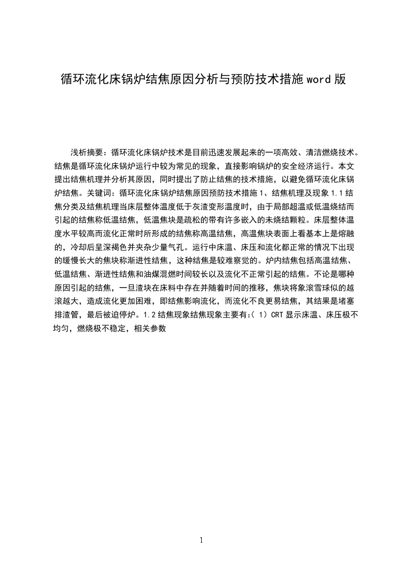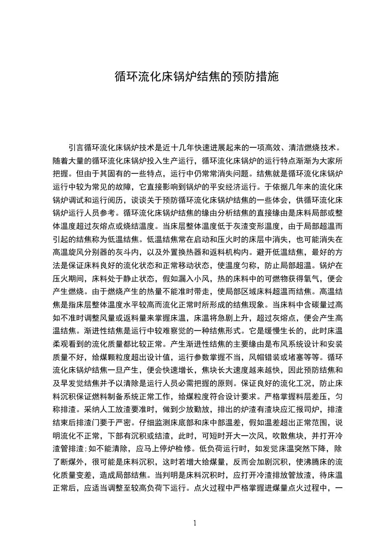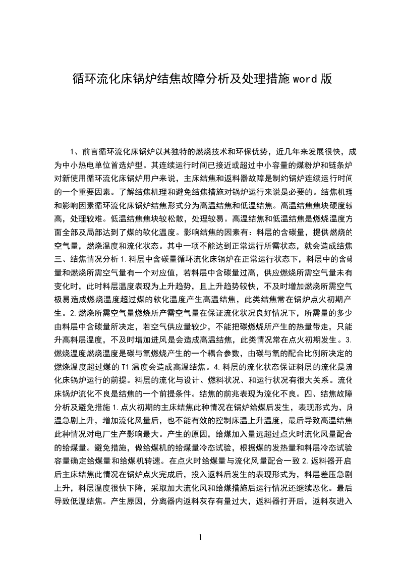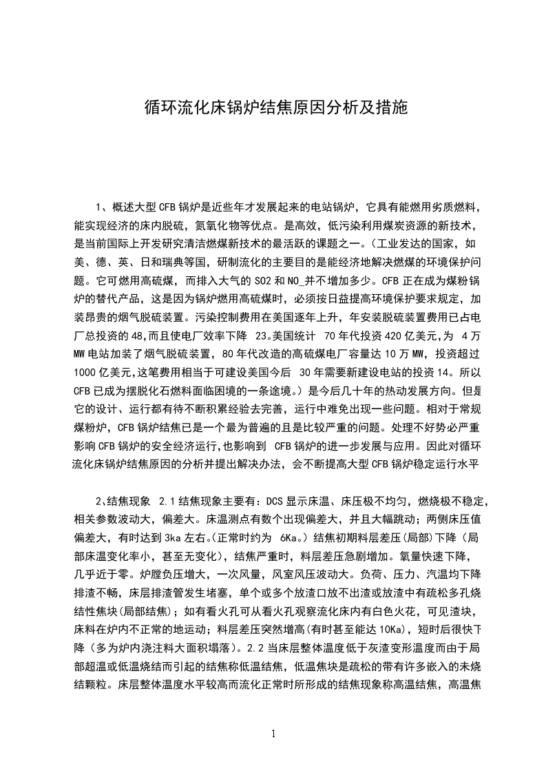 引言循环流化床锅炉技术是近十几年快速进展起来的一项高效、清洁燃烧技术。随着大量的循环流化床锅炉投入生产运行,循环流化床锅炉的运行特点渐渐为大家所把握。但由于其固有的一些特点,运行中仍常常消失问题。结焦就是循环流化床锅炉运行中较为常见的故障,它直接影响到锅炉的平安经济运行。于依据几年来的流化床锅炉调试和运行阅历,谈谈关于预防循环流化床锅炉结焦的一些体会,供循环流化床锅炉运行人员参考。循环流化床锅炉结焦的缘由分析结焦的直接缘由是床料局部或整体温度超过灰熔点或烧结温度。当床层整体温度低于灰渣变形温度,由于局部超温而引起的结焦称为低温结焦。低温结焦常在启动和压火时的床层中消失,也可能消失在高温旋风分别器的灰斗内,以及外置换热器和返料机构内。避开低温结焦,最好的方法是保证床料良好的流化状态和正常移动状态,使温度匀称,防止局部超温。锅炉在压火期间,床料处于静止状态,假如漏入小风,热的床料中的可燃物获得氧气,便会产生燃烧。由于燃烧产生的热量不能准时带走,使局部区域床料超温而结焦。高温结焦是指床层整体温度水平较高而流化正常时所形成的结焦现象。当床料中含碳量过高,如不准时调整风量或返料量来掌握床温,床温将急剧上升,超过灰熔点,便会产生高温结焦。渐进性结焦是运行中较难察觉的一种结焦形式。它是缓慢生长的,此时床温柔观看到的流化质量都比较正常。产生渐进性结焦的主要缘由是布风系统设计和安装质量不好,给煤颗粒度超出设计值,运行参数掌握不当,风帽错装或堵塞等等。循环流化床锅炉结焦一旦产生,便会快速增长,焦块长大速度越来越快,因此预防结焦和及早发觉结焦并予以清除是运行人员必需把握的原则。保证良好的流化工况,防止床料沉积保证燃料制备系统正常工作,给煤粒度符合设计要求。严格掌握料层差压,匀称排渣。采纳人工放渣要准时,做到少放勤放,排出的炉渣有渣块应汇报司炉,排渣结束后排渣门要于严密。仔细监测床底部和床中部温差,假如温差超出正常范围,说明流化不正常,下部有沉积或结渣,此时,可短时开大一次风,吹散焦块,并打开冷渣管排渣;如不能清除,应马上停炉检修。低负荷运行时,如发觉床温突然下降,除了断煤外,很可能是床料沉积,这时若增大给煤量,反而会加剧沉积,使沸腾床的流化质量变差,造成局部结焦。当判明是床料沉积时,应打开冷渣排放管放渣,待床温正常后,应适当调整至较高负荷下运行。点火过程中严格掌握进煤量点火过程中,一般床温达到500以上可加入少量的煤以提高床温。假如加煤量过多,由于煤粒燃烧不完全,整个床料含碳量增大,这时一经加大风量,就会猛烈燃烧,床温上升很快,甚至超过灰的软化温度,结果造成整床超温结焦。当床温超过1050,虽经减煤加风措施,床温仍旧上升,此时必需马上停炉压火,一般待床温低于800再启动。变负荷运行严格掌握床温变负荷运行时,严格掌握床温在允许范围内,做到升负荷先加风后加煤,降负荷先减煤后减风,燃烧调整要做到少量多次的调整方法,避开床温大起大落。压火时正确操作压火时先停给煤,再运行几分钟后停风机,压火期间,肯定要紧闭各炉门、全部进风门及排渣门。仔细调整一二次风对于高温分别器,保证任何时候含氧量不低于3%5%,以降低飞灰可燃物含量,可防止分别器和返料机构内发生二次燃烧而超温。运行中要定期察看返料的状况,监视返料器床层的温度是否正常。若超出正常值许多,可能是发生了二次燃烧。此时应加大返料风量,打开返料床排灰阀放灰。若温度低于正常值许多,说明返料器发生了堵塞,此时应打开排灰阀放灰,同时加大返料风量。若仍不能消退故障,则必需压火检修。锅炉启动期间,返料装置应布满灰锅炉启动期间,返料装置必需布满灰后方可投入,否则风会反窜。点火初期先不投返料风,待底料中的细灰布满返料装置后则应开返料风(一般是点火后半小时),保证床内有料,否则,床温将难以掌握。安装炉膛差灰装置和返料增压风机为监视返料机构是否正常工作,避开结焦或堵塞,可安装炉膛差压装置和返料增压风机。炉膛差压指燃烧室上界面与炉膛出口之间的压力差,是监视返料器是否正常工作的一个参数。一般炉膛差压掌握在0.5ka以上。运行中若炉膛差压突然降低,则表明物料循环中止,返料器发生了堵塞。运行中只要仔细监视炉膛差压,返料机构结焦是可以预防的。为提高返料风压头,保证返料床层良好的流化和移动状态,在一次风压不能满意返料要求时,安装返料风增压风机对预防返料器结焦是特别有意义的。转变燃煤的焦结特性做好入炉煤的搭配,转变燃煤的焦结特性,对预防循环流化床锅炉结焦具有明显的有用意义。启运前预备充分在每次锅炉启动前,应仔细检查风帽、风室,清理杂物,启动时,应进行冷态流化试验,确认床层布风匀称,流化良好。结语在流化床锅炉运行中,良好的流化质量是防止结焦的关键,同时运行中尚应仔细调整好煤量、风量,严格掌握床温及料层差压等运行参数,如此,流化床锅炉结焦是可以避开的,锅炉的平安运行就可以得到保证。