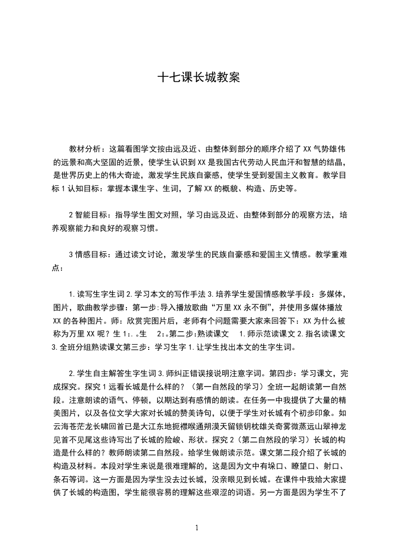 教材分析:这篇看图学文按由远及近、由整体到部分的顺序介绍了XX气势雄伟的远景和高大坚固的近景,使学生认识到XX是我国古代劳动人民血汗和智慧的结晶,是世界历史上的伟大奇迹,激发学生民族自豪感,使学生受到爱国主义教育。教学目标1认知目标:掌握本课生字、生词,了解XX的概貌、构造、历史等。