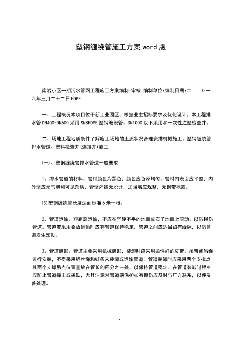 一、工程概况本项目位于新工业园区,根据业主招标要求及优化设计,本工程排水管DN400-DN60东用SN8HDE1钢缠绕管。DN1000以下采用和一次性注塑检查井。
