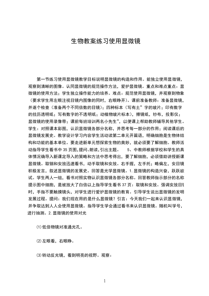 第一节练习使用显微镜教学目标说明显微镜的构造和作用。能独立使用显微镜,观察到清晰的图像。认同显微镜的规范操作方法,爱护显微镜。重点和难点重点:显微镜的使用方法;学生独立操作能力的培养。难点:规范使用显微镜,并观察到物象(要求学生用左眼注视目镜内图像的同时,右眼睁开)。课前准备教师:准备显微镜,并逐个检查(准备两个不同倍数的目镜);四种标本(写有土”字的玻片;印有数字的挂历透明纸;写有数字的不透明纸;动植物玻片标本),擦镜纸,纱布,投影仪;显微镜的使用录像带;课前每班培训两名小先生”,以便课上帮助教师辅导其他学生。学生:对照课本彩图,认识显微镜各部分名称,并思考每一部分的作用;阅读课后的显微镜发展史。教学设计学习内容学生活动读第二单元开篇语,明确细胞是生物体结构和功能的基本单位。要走进新单元想探索生物的奥妙,就必须要了解细胞。教师活动指导学生看书中35页图,提问、朗读,引出主题。5、中教师根据学校和学生的具体情况确导入新课定导入的策略和方法中思考得出,要了解细胞,必须借助讲授新课显微镜。取钿和安放迅速看书,动手取镜和安放。右手握,左手托;略偏左,安目镜。积极发言,叙述显微镜的发展史。回答是光学显微镜。1.显微镜的构造兴奋,跃跃欲试。学生两人一组,看书对照实物认识显微镜各部分名称。回答教师指示部分的名称。提示图中细胞,是被放大了白倍以上指导学生看书37页:取镜和安放。强调安放目镜时,手指不要触摸镜头,对学生进行爱护显微镜的教育。引导学生说出显微镜的发明、发展过程。提问:我们现在用的是什么显微镜?引言:今天我们一起来认识显微镜,并争取达到人人会使用显微镜。指导学生学会通过看书来认识显微镜。随机叫学号,进行抽测。2.显微镜的使用对光