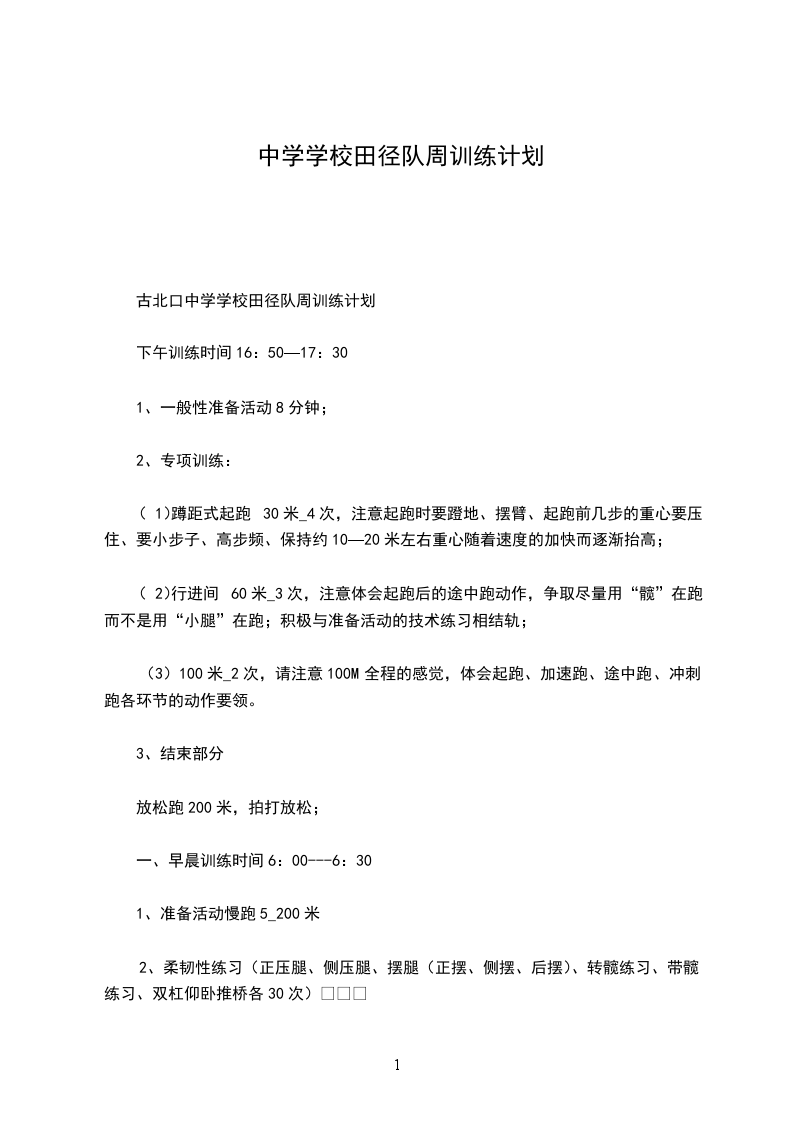 (七)专项训练:100米、200米、400米、800米、1500米、3000米、跳高、跳远、接力4100米、4400米;训练安排星期一速度训练星期二反应训练星期三耐力训练星期四柔韧训练星期五调整训练周一速度训练周二爆发力训练周三专项训练周四力量训练早上训练安排星期一速度训练:1.准备活动:a.绕场地7圈b.30米小步跑、高抬腿、车轮跑、后蹬跑、行进间踢腿各两组c.绕场地“s”字形跑两组2.测试:加速跑3050米4组3.放松星期二反应训练:1.准备活动:a.绕场地7圈。b.拉韧带练习。c.30米折返跑、反方向起跑训练、听信号做起跑练习、听哨音做跑停练习。2测试:30米6组、立定三级跳。3.放松星期三耐力训练: