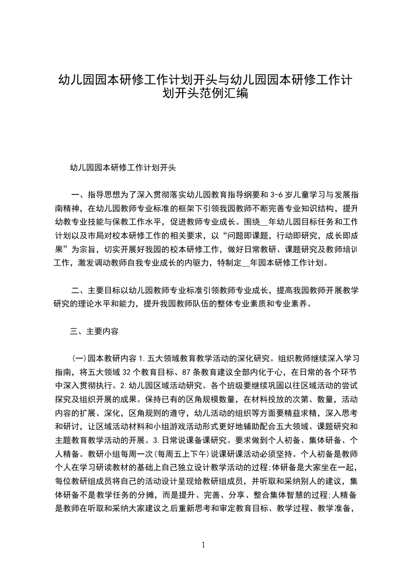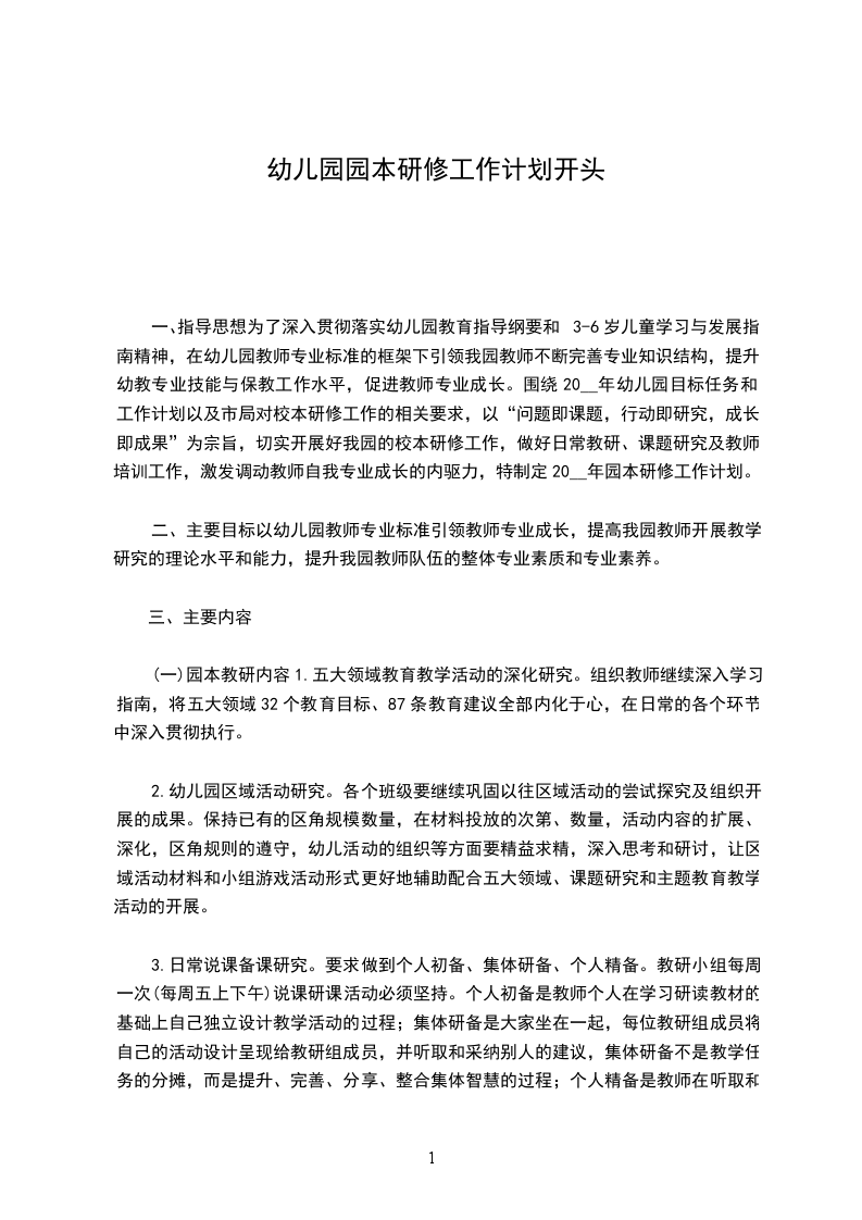 一、指导思想为了深入贯彻落实幼儿园教育指导纲要和3-6岁儿童学习与发展指南精神,在幼儿园教师专业标准的框架下引领我园教师不断完善专业知识结构,提升幼教专业技能与保教工作水平,促进教师专业成长。围绕20__年幼儿园目标任务和工作计划以及市局对校本研修工作的相关要求,以“问题即课题,行动即研究,成长即成果”为宗旨,切实开展好我园的校本研修工作,做好日常教研、课题研究及教师培训工作,激发调动教师自我专业成长的内驱力,特制定20__年园本研修工作计划。
