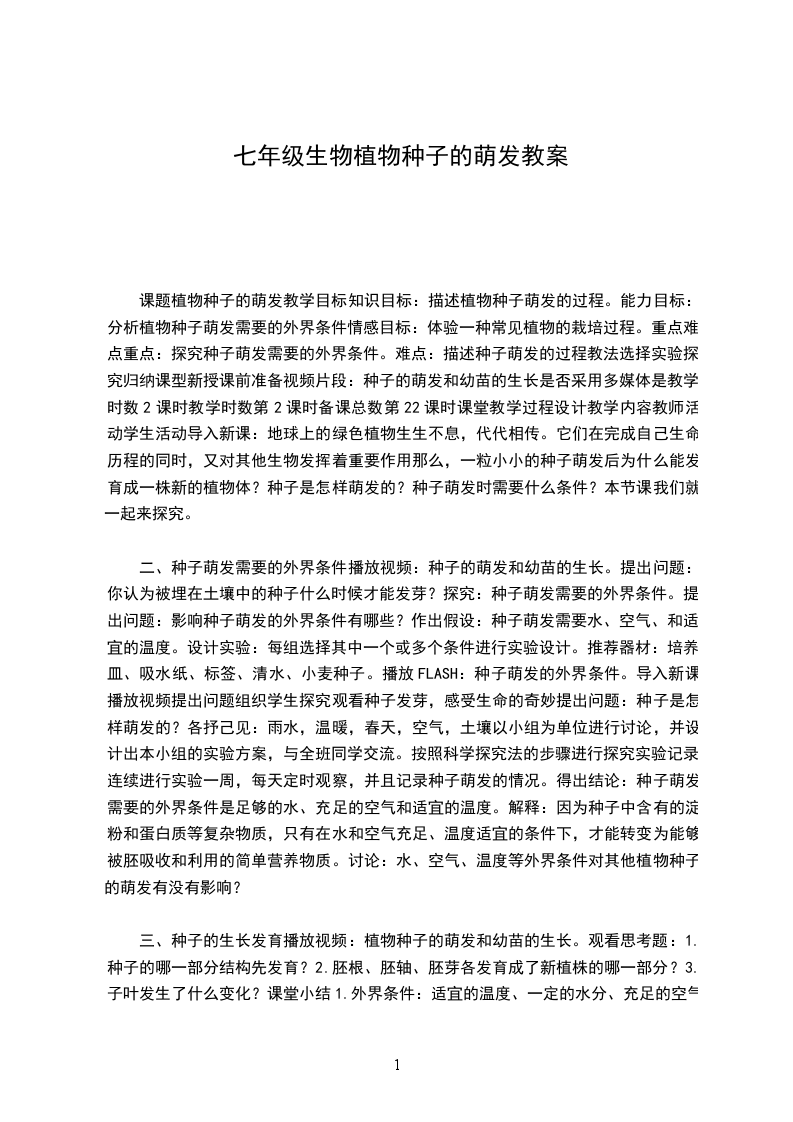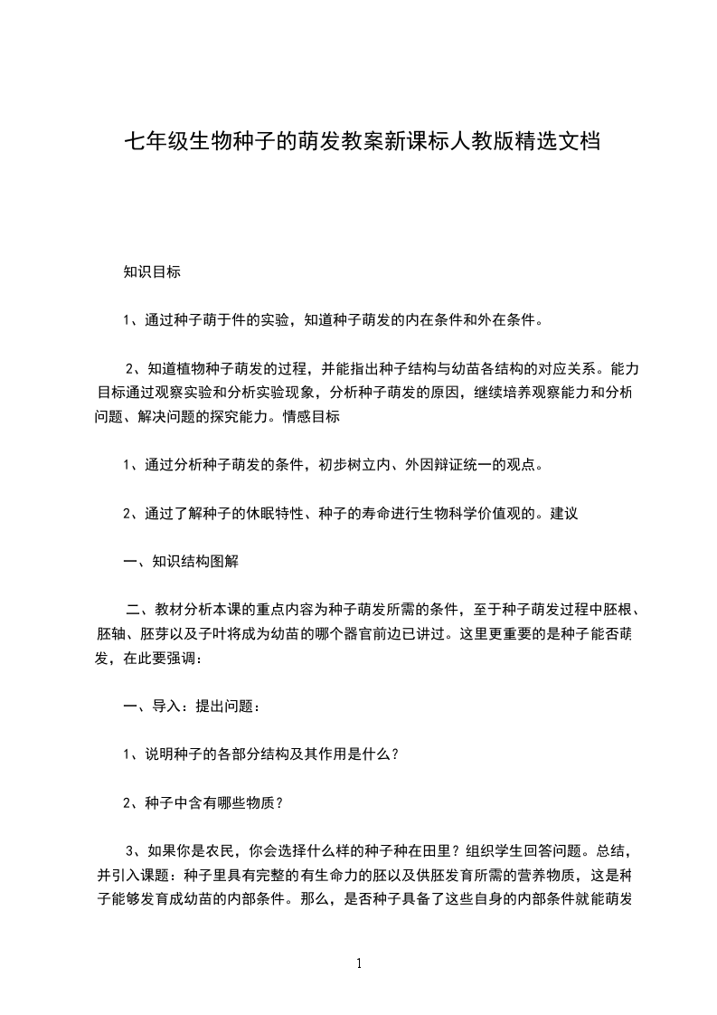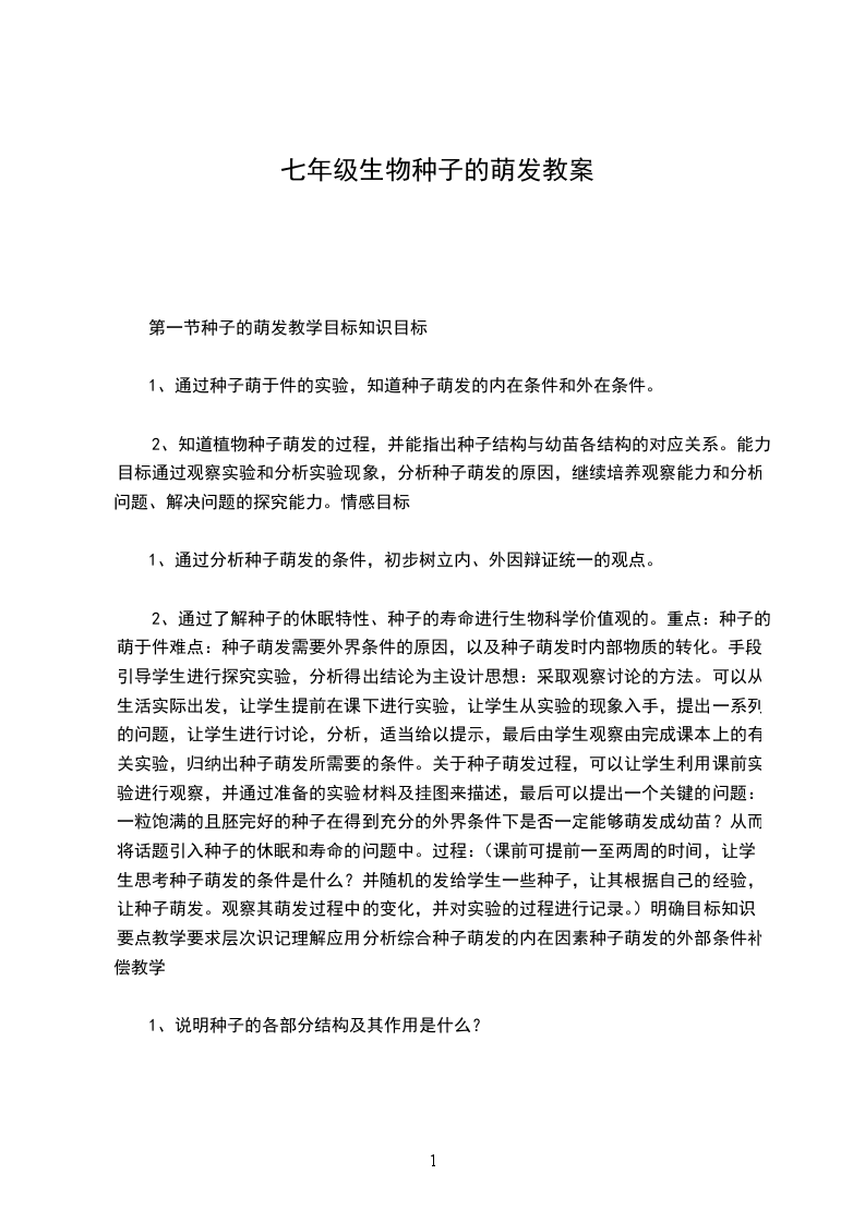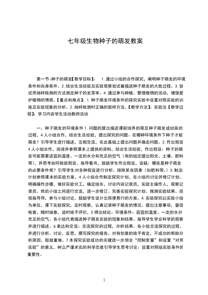 2、通过了解种子的休眠特性、种子的寿命进行生物科学价值观的。重点:种子的萌于件难点:种子萌发需要外界条件的原因,以及种子萌发时内部物质的转化。手段:引导学生进行探究实验,分析得出结论为主设计思想:采取观察讨论的方法。可以从生活实际出发,让学生提前在课下进行实验,让学生从实验的现象入手,提出一系列的问题,让学生进行讨论,分析,适当给以提示,最后由学生观察由完成课本上的有关实验,归纳出种子萌发所需要的条件。关于种子萌发过程,可以让学生利用课前实验进行观察,并通过准备的实验材料及挂图来描述,最后可以提出一个关键的问题:一粒饱满的且胚完好的种子在得到充分的外界条件下是否一定能够萌发成幼苗?从而将话题引入种子的休眠和寿命的问题中。过程:(课前可提前一至两周的时间,让学生思考种子萌发的条件是什么?并随机的发给学生一些种子,让其根据自己的经验,让种子萌发。观察其萌发过程中的变化,并对实验的过程进行记录。)明确目标知识要点教学要求层次识记理解应用分析综合种子萌发的内在因素种子萌发的外部条件补偿教学