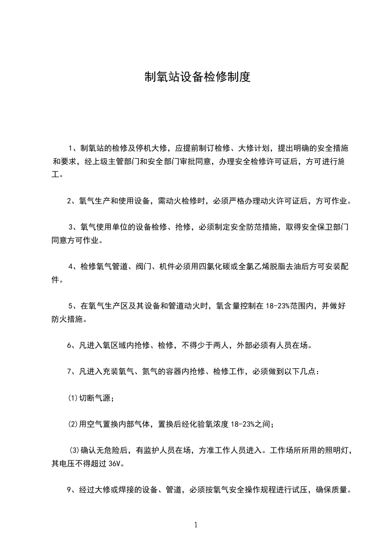 1、制氧站的检修及停机大修,应提前制订检修、大修计划,提出明确的安全措施和要求,经上级主管部门和安全部门审批同意,办理安全检修许可证后,方可进行施工。