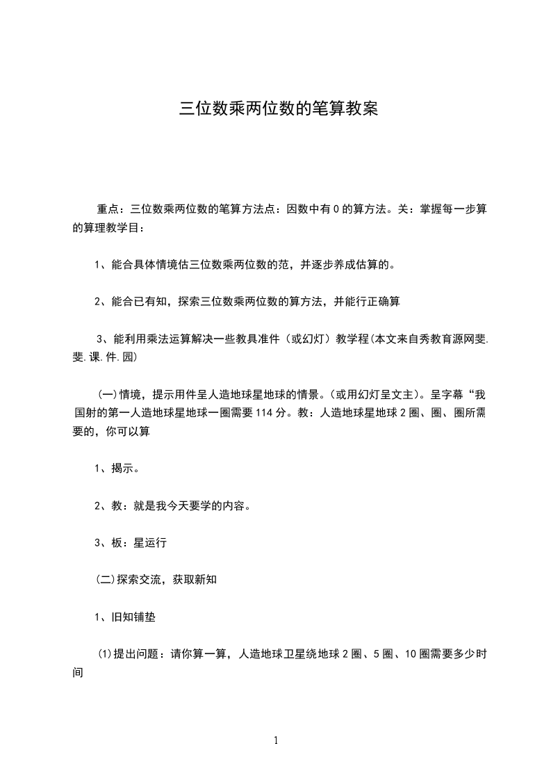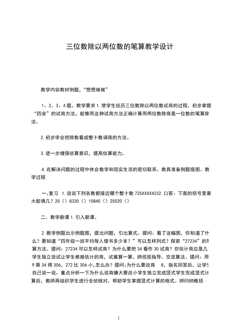 184238(棵)集体订正后,教师让学生进一步体会学习三位数除以两位数的笔算除法能解决生活中的实际问题。小结:通过今天的学习,你掌握了一个什么技能?课外作业:补充习题册p6教后记:课堂巡视发现学生试商的能力差距很大,有的学生能很快找到准确的商,有的学生却需要费很大的力气才能找到商,而且作业本的书面整洁没有保证,发现有的学生用铅笔先试商,等找到准确的商以后再钢笔计算,这样的“经验”应该在困难生中推广,以提高作业书写的质量。