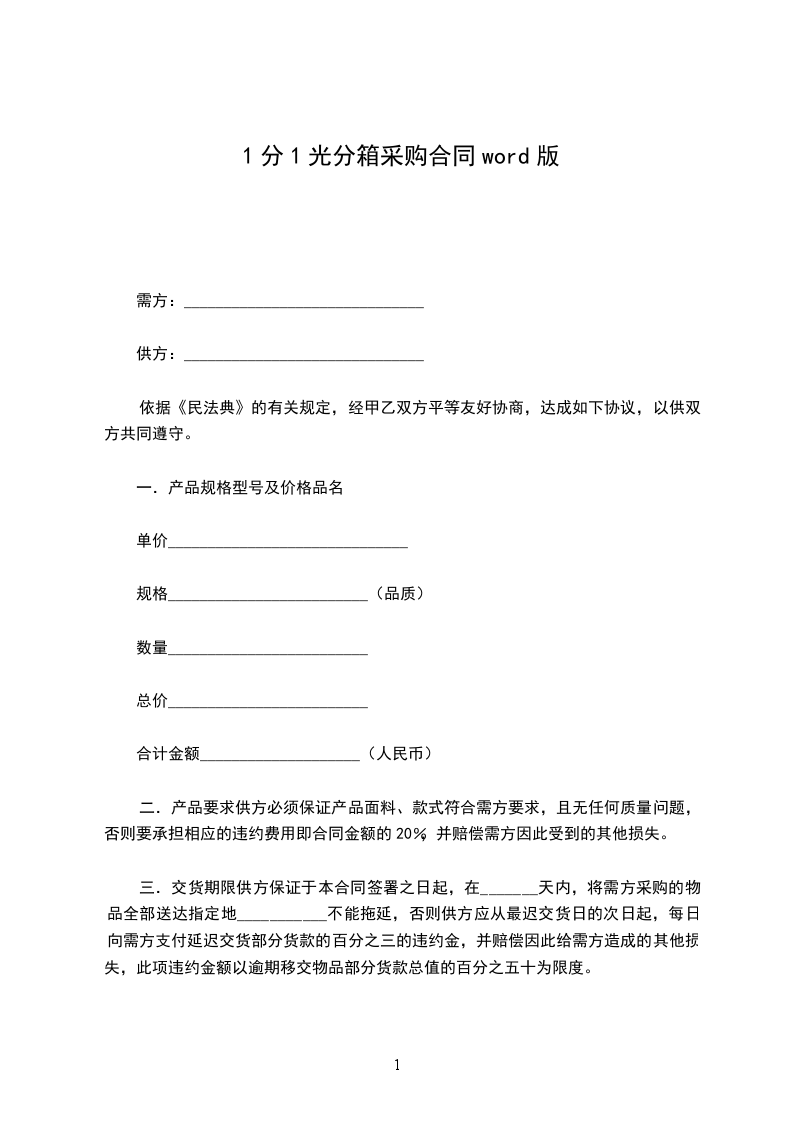 三.交货期限供方保证于本合同签署之日起,在_______天内,将需方采购的物品全部送达指定地___________不能拖延,否则供方应从最迟交货日的次日起,每日向需方支付延迟交货部分货款的百分之三的违约金,并赔偿因此给需方造成的其他损失,此项违约金额以逾期移交物品部分货款总值的百分之五十为限度。