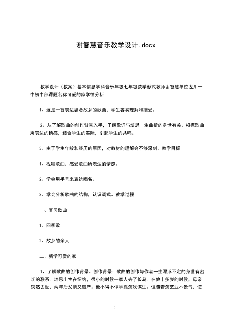 教学设计(教案)基本信息学科音乐年级七年级教学形式教师谢智慧单位龙川一中初中部课题名称可爱的家学情分析
