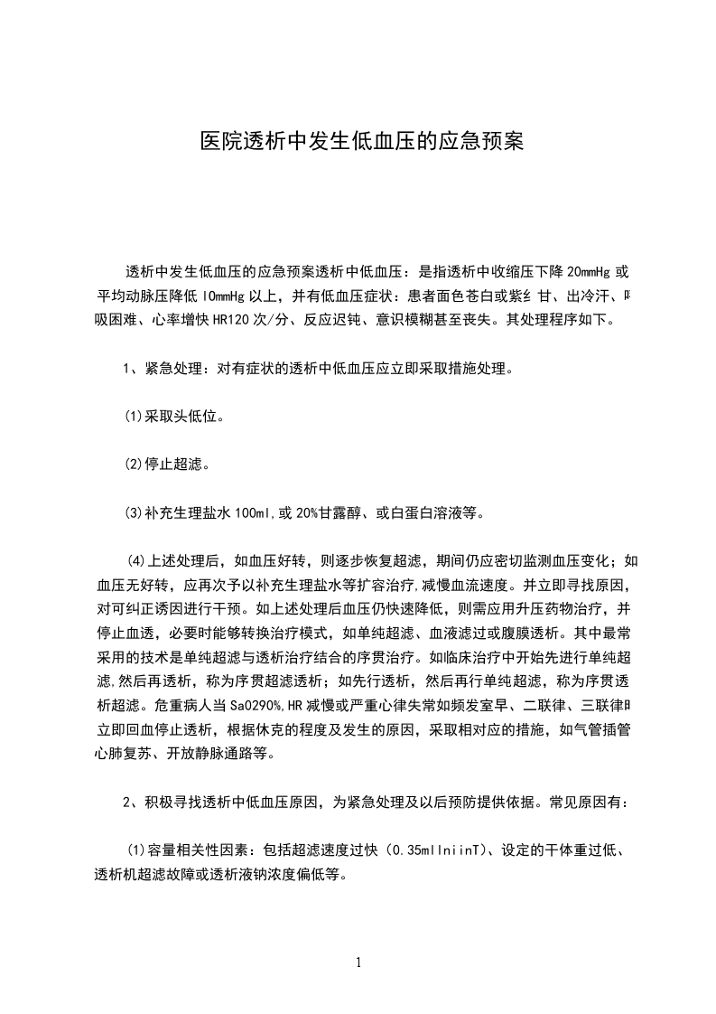透析中发生低血压的应急预案透析中低血压:是指透析中收缩压下降20mmHg或平均动脉压降低lOmmHg以上,并有低血压症状:患者面色苍白或紫纟甘、出冷汗、呼吸困难、心率增快HR120次/分、反应迟钝、意识模糊甚至丧失。其处理程序如下。