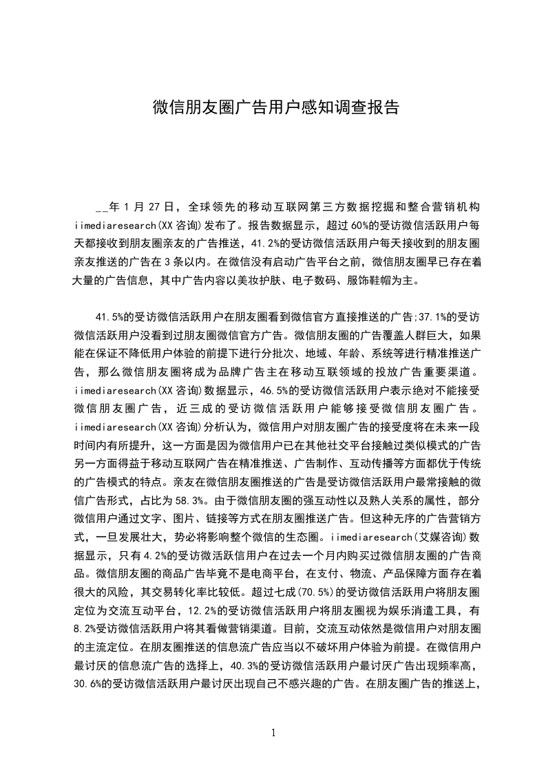 __年1月27日,全球领先的移动互联网第三方数据挖掘和整合营销机构iimediaresearch(XX咨询)发布了。报告数据显示,超过60%的受访微信活跃用户每天都接收到朋友圈亲友的广告推送,41.2%的受访微信活跃用户每天接收到的朋友圈亲友推送的广告在3条以内。在微信没有启动广告平台之前,微信朋友圈早已存在着大量的广告信息,其中广告内容以美妆护肤、电子数码、服饰鞋帽为主。