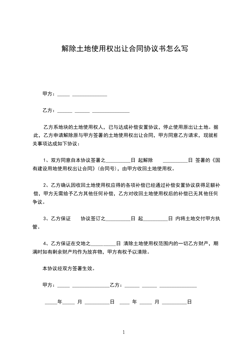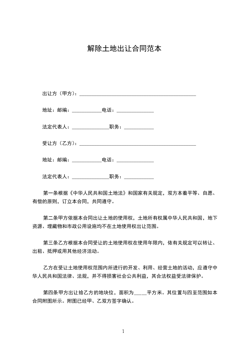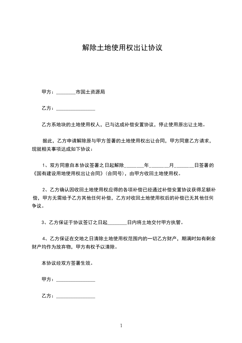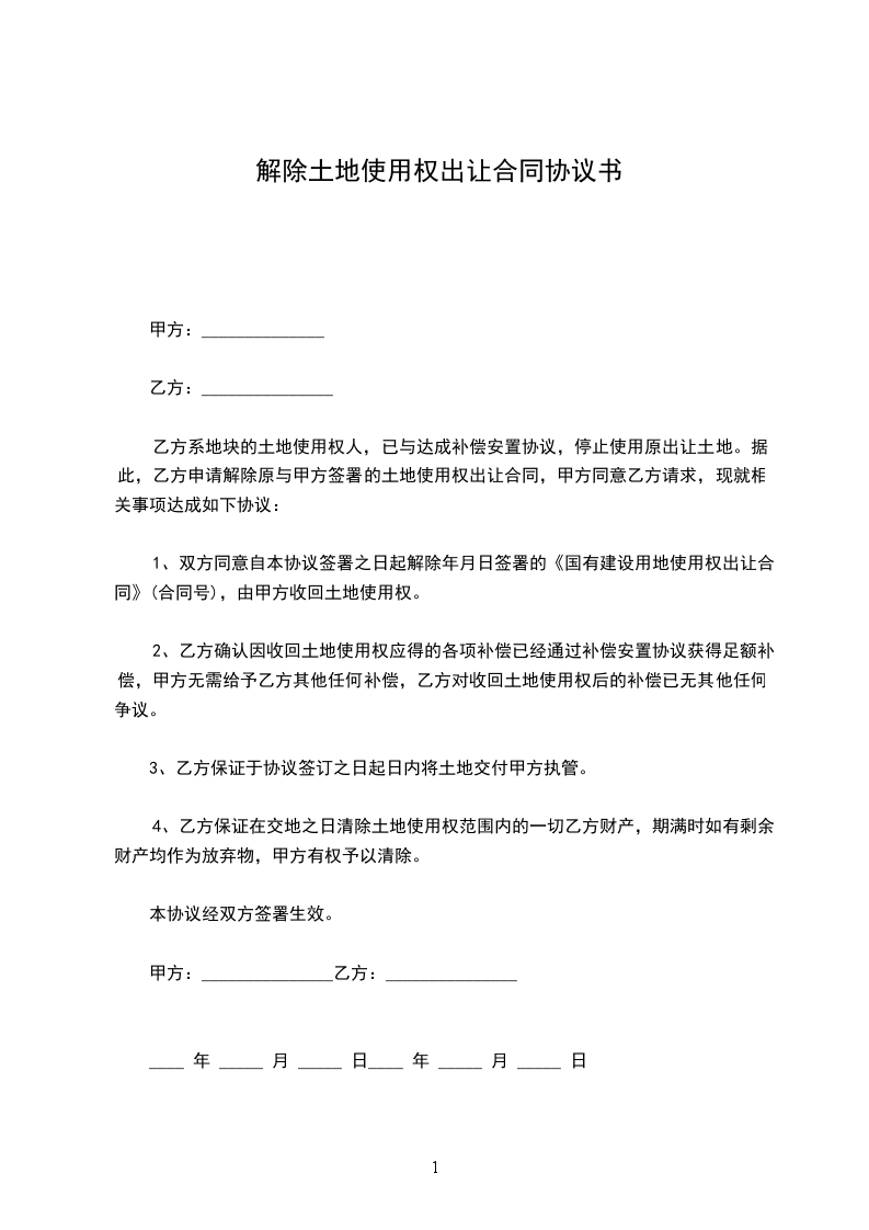 1、双方同意自本协议签署之日起解除_____年_____月_____日签署的《国有建设用地使用权出让合同》(合同号),由甲方收回土地使用权。
