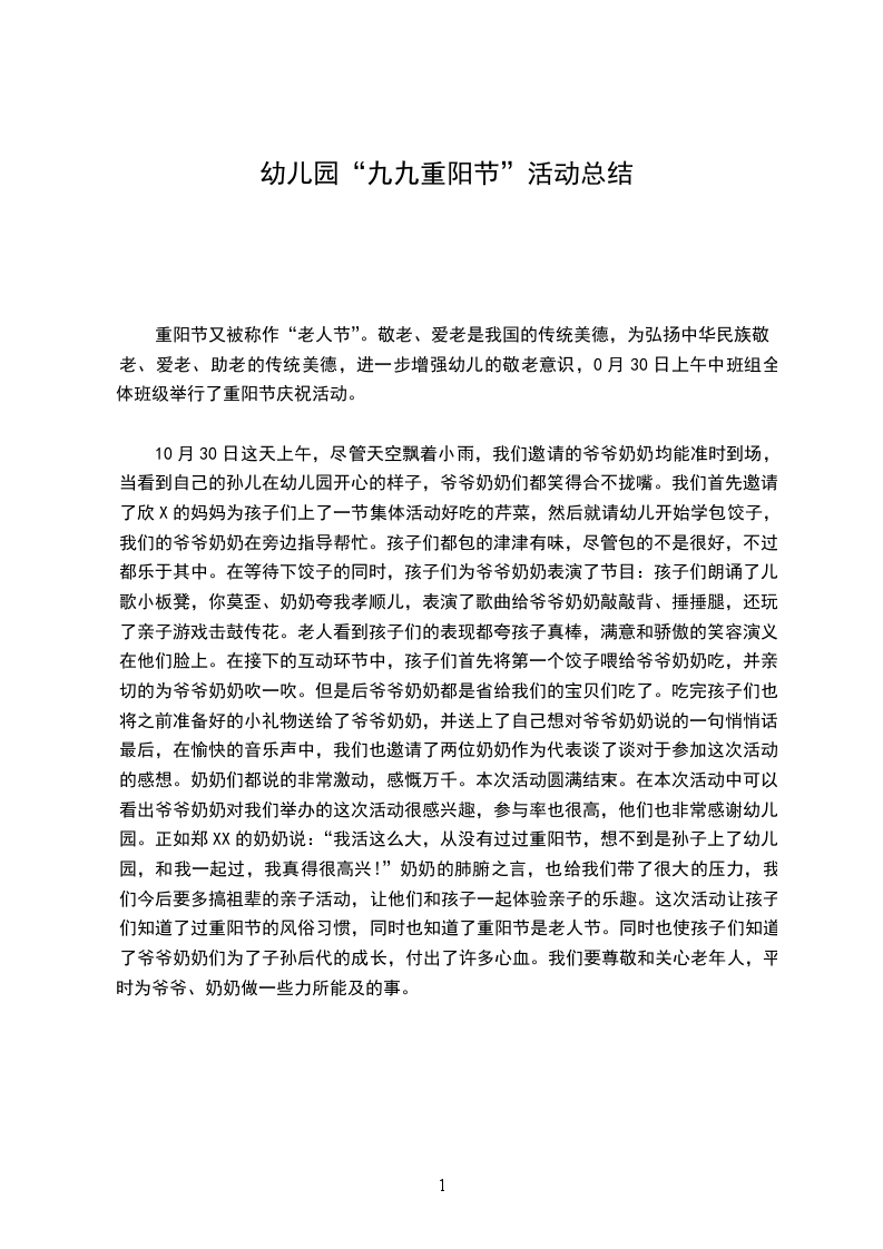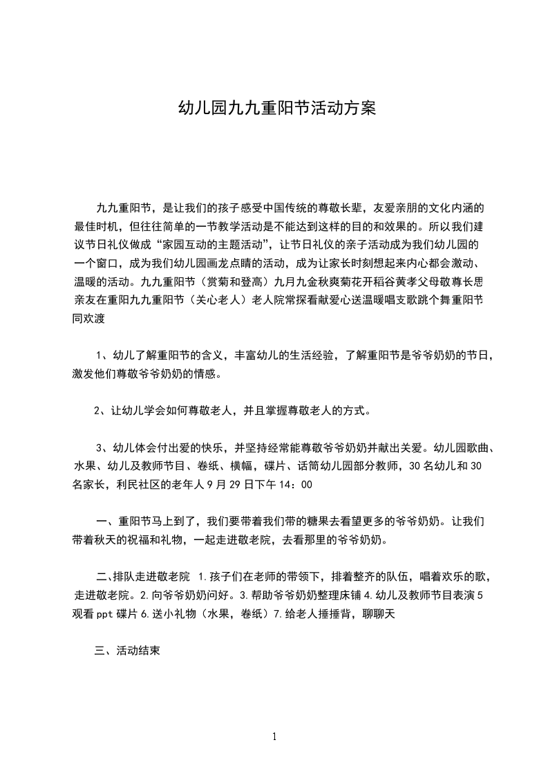 5、延伸活动:请家长协作,让幼儿在家里帮爷爷、奶奶做力所能及的事情。活动评析:这天早晨,汶河幼儿园内鼓号齐鸣,二十位幼儿齐念“重阳到”拉开了活动的序幕。孩子们将细心预备好的节目献给在场的老人家,还将亲自包装的“鲜花”送到了老人家的手里,亲一亲、抱一抱,并送上了祝愿的话语,孩子们感动了全部在场的老人家,路边的老奶奶流下了感动的眼泪,感动地说“感谢,感谢。”敬老活动得到了圆满的成功,透过这样的活动,孩子们懂得了尊敬老人是中华民族的传统美德,是我们应有的品德,并懂得怎样尊敬老人。同时,让孩子体验与老人家联欢的欢乐。也让老人家感受到被关怀的欢乐。
