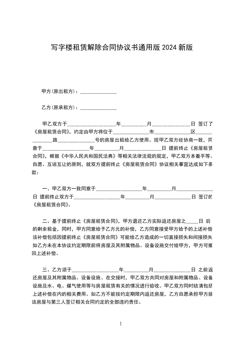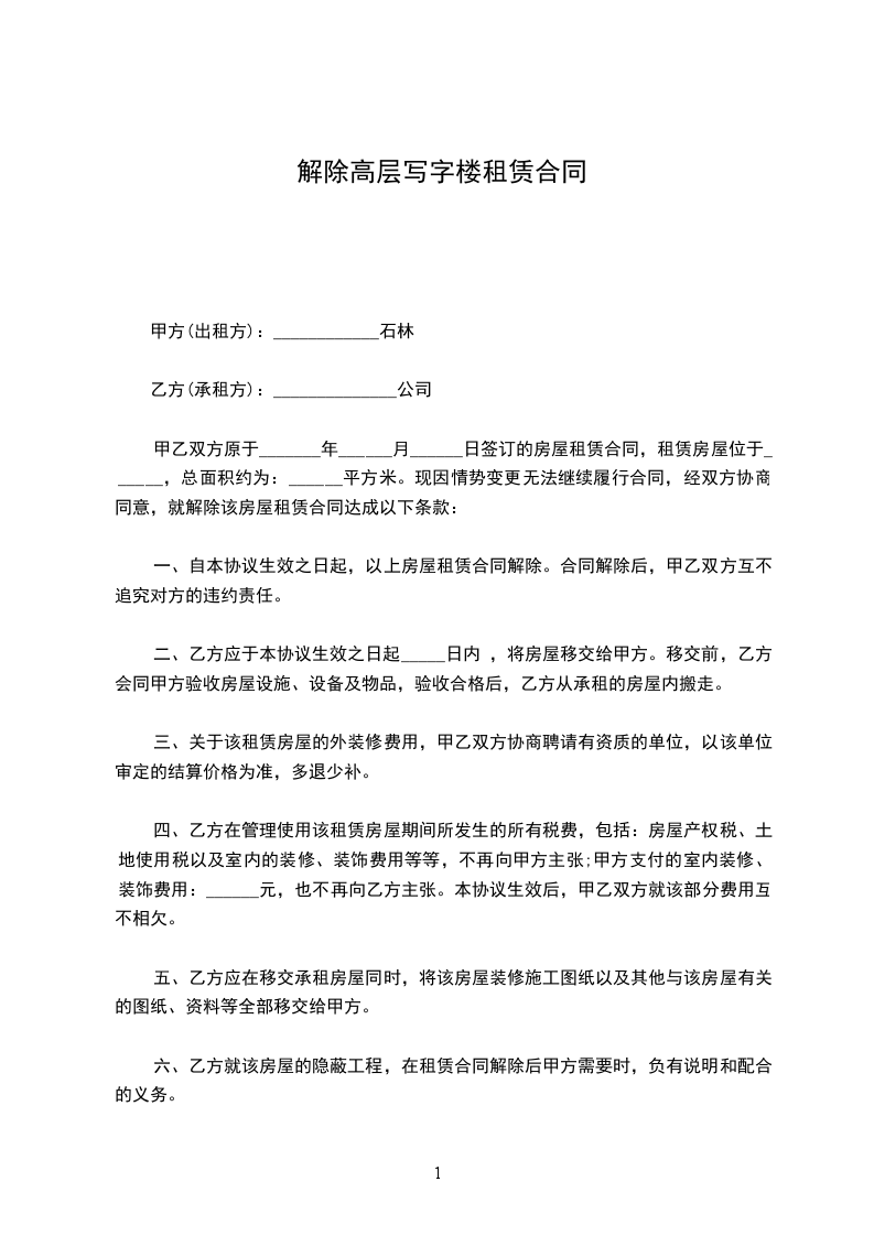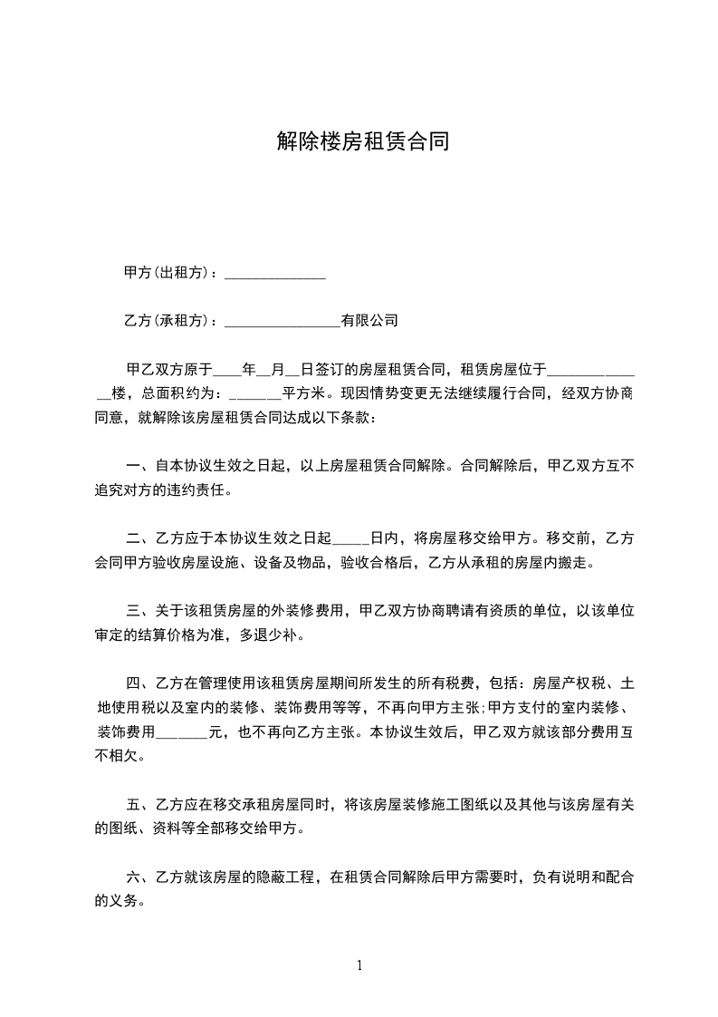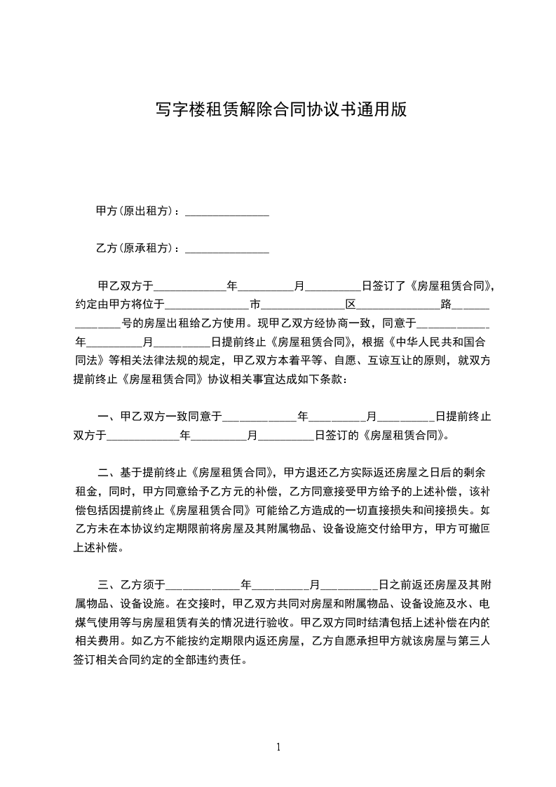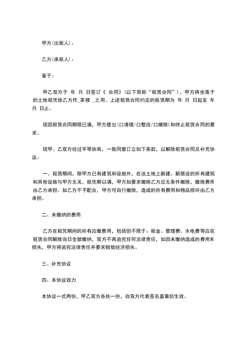 一、甲乙双方一致同意于_____________年__________月__________日提前终止双方于_____________年__________月__________日签订的《房屋租赁合同》。