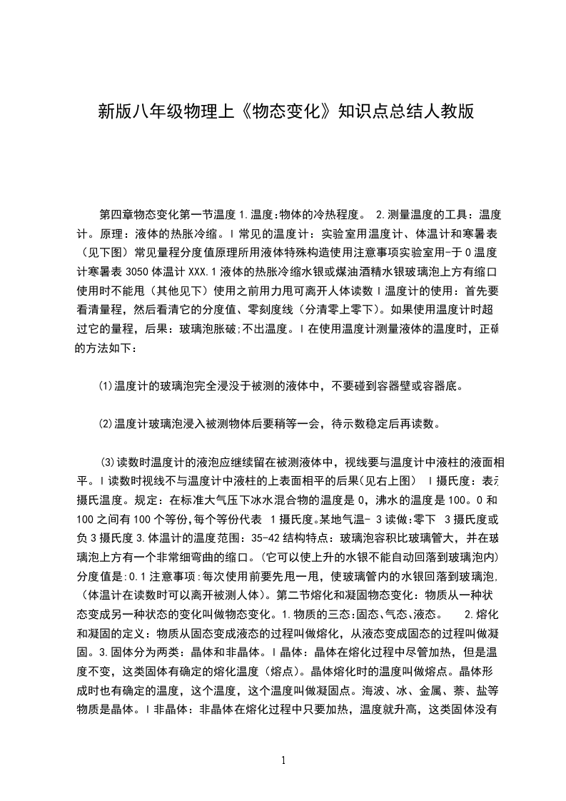 (3)的分析:EF段放热、温度降低,物质为液态;G段(凝固过程)放热、温度不变,物质状态为固液共存。GH段放热、温度降低,物质为固态。4.探究实验:固体熔化时温度的变化规律(见右下图)、盛、。(【实验器材】铁架台、酒精灯、石棉网(使烧杯受热均匀)水的烧杯(水浴法:使试管受热均匀)试管(装有蜡或海波)温度计、搅拌器、秒表、火柴)【设计实验】将温度计插入试管后,待温度升至40左右时开始,每隔大约1min记录一次温度;海波或蜡完全熔化后再记录45次。【实验表格】时间/min012345海波的温度/蜡的温度/5.晶体熔化的特点:不断吸热,温度不变。晶体熔化的条件:达到熔点;续吸热。晶体凝固的条件:达到凝固点;续放热。6.非晶体熔化的特点:吸热,温度不断升高。7.利用和防止熔化吸热、凝固放热的实例:l利用熔化吸热:用冰保鲜、冷敷给病人降温;雪糕解暑。l防止熔化吸热:雪熔化吸热,多穿衣服,防止感冒。l利用凝固放热:冬天在菜窖中放几桶水。(l下过雪后,为了加快雪熔化,常用洒水车在路上洒盐水。降低雪的熔点)l化雪的天气有时比下雪时还冷。(雪熔化吸热)l鲜鱼保鲜,用00C的冰比00C的水效果好。(冰熔化吸热)l蒸发:只发生在液体表面的缓慢的汽化现象叫蒸发。第三节汽化和液化1.2.汽化和液化的定义:物质从液态变成气态的过程叫做汽化,从气态变成液态的过程叫做液化。3.汽化:蒸发和沸腾是两种典型的汽化现象。ll沸腾:沸腾是液体表面和内部同时发生的剧烈的汽化现象。l纸盖作用:减少热量损失,加速沸腾;孔作用:平衡烧杯内外气压沸腾的特点:不断吸热,温度不变。沸腾的条件:达到沸点;续吸热(温差是吸热的前提)。沸点:各种液体沸腾时都有确定的温度,这个温度叫做沸点。不同液体的沸点不同。沸点与气压的关系:一切液体的沸点都是气压减小时降低,气压增大时升高气泡大小变化情况:沸腾前,由于温差水蒸气泡上升过程中温度降低不断液化,因此气泡由大变小;腾后,水温XX,水蒸气泡受液体压强影响,因此气泡由小变大。蒸发在任何温度下都能发生。加快液体蒸发的方法:增大液体的表面积;高液体的温度;大液体表面的空气流动速度。作用:蒸发吸热(吸外界或自身的热量),具有制冷作用。l蒸发和沸腾是汽化的两种方式,它们的异同如下表所示。不同点蒸发只在液体表面进行在任何温度下都能发生缓慢地汽化温度降低沸腾液体内部和表面同时发生必须达到沸点且继续加热剧烈地汽化温度保持不变相同点1.都是汽化现象2.都使液体变成气体3.都要吸收热量3液化:物质从气态变成液态的过程,需要放热。l4.液化的方法分为:降低温度、压缩体积两种方法l降低温度(遇冷、放热)液化:l雾与露的形成(空气中水蒸气遇冷液化成雾状小水珠;在尘埃浮在空中,l形成“雾”;在草木,聚成“露”)l冬天,嘴里呼出“白气”。夏天,冰棍周围冒“白气”。l(水蒸气遇冷液化成雾状小水珠)l冬天,窗户内侧常看见模糊的“水气”。(屋内水蒸气遇到冷玻璃液化成小水珠)l压缩体积液化:”l在常温下,将石油气压缩放入钢瓶中,以液态石油气的形式保存。l“长征”火箭的燃料和助燃剂分别是:压缩成的“液态氢”和“液态氧。打火机中,常用压缩后的液态“丁烷”作为燃料。第四节升华和凝X1.升华和凝X的定义:物质从固态直接变成气态叫升华;气态直接变成固态叫凝X。2.升华也需要吸热热,凝X也会放热。3.常见的升华现象:樟脑片变小;干冰进行人工降雨;天晾衣服,冰直接升华;升华。4.常见的凝X现象:霜、雪、冰花、雾凇;炽灯变黑(钨丝先升华后凝X)常见的各种生活现象以及其物态变化:熔化1冰棒含在嘴里化了2春天河里的冰化成水3春天冰雪融化成溪流4吃冰棒解热5早春河面上的冰的消融6用雪堆的雪人时间长了雪人变矮7剥去包装纸,过一会儿,冰棒“流汗”凝固1水正在慢慢地结冰2出炉的钢水变成钢锭3冬天,户外的湿衣服会结一层冰4寒冷的冬季,融化后的雪水又形成晶剔透的玉柱汽化1秋天清晨的雾在太阳出来后散去2夏天湿衣服晾干3擦在皮肤上的酒精马上干了4把洗过的衣服挂起来,衣服很快就变干了5用电吹风机把湿头发吹干6夏天,洒在地上的水变干了7放在冷冻室的鲜肉脱水了8打开酒精瓶,酒精跑掉了9锅里的水烧开一段时间,水变少了液化1烧开水时冒的“白气”2夏秋天清晨的雾3夏天清晨花草叶子上附着的露水4夏天打开冰箱冷冻室的门,我们可以看到冒“白气”5夏天从冰箱中取出的瓶装矿泉水,瓶的外壁会出汗,一会又消失(液化和汽化)6早春的雨7深秋的露8夏天我们看到的冰棒冒白气9夏天阴凉地方的石头比较湿润10舞台上用干冰制作“云雾”(干冰升华吸热致使周围温度降低,水蒸气液化成小水滴)11冬天戴眼镜的人从室外进入温暖房间内,镜片上出现一层雾12冬天室内玻璃上的小水珠13冰棒冒白汽14冬天从人们口中呼“白气”15夏天自来水管的外壁上出现水珠16有风的天气,游泳后从水中出来会出现小水球17冰棒的周围出现白气18清晨起来看到荷叶中心有大团的水珠19在冷饮杯中加入冰块后不久,杯壁就会出现水珠20高压锅煮饭冒白气21家庭厨房的窗户玻璃及墙面上有许多小油滴23大自然造化而成的变化莫测的黄山云海24初夏江面上浩浩浓雾的形成升华1樟脑丸放在衣橱里变小了2冬天,室外冰冻的衣服干了3用久的白炽灯变黑4灯泡用久了,灯丝变细5碘受热直接变成了紫色气体凝华1冬天