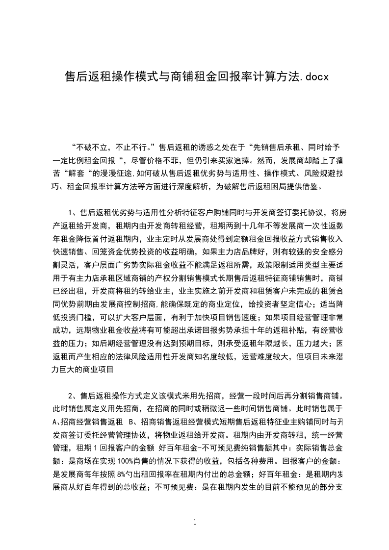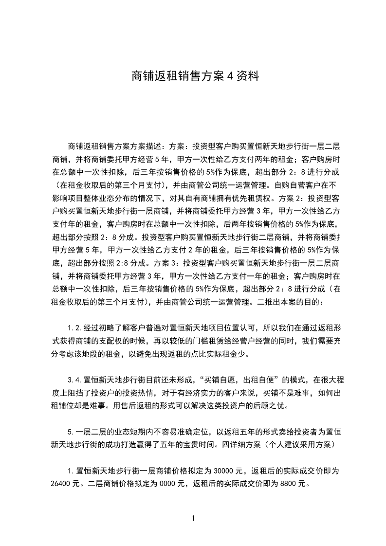 三、各类返租优惠措施一)带租约发售内容与积极意义:发展商与有意向经营商铺的客户进行洽谈,签订合作意向协定。当有其他买家购买到本商铺时,发展商将前期签订的意向客户介绍给该商铺的买家,进行租赁本商铺的细节洽谈,保证商铺的投资回报,让买家购买到商铺时就可拥有了稳定租约(回报)。二)5年返租回报具体内容:买家购买本项目商铺单位后,无须自己经营,将物业回租发展商统一经营,每年从发展商这里获得投资总额810%的稳定回报,5年后,发展商将该商铺单位归还给买家,届时买家将拥有一个成熟的铺位,可自用也可出租。积极作用:有利于拓宽商铺销售层面,缩短销售周期,减少投资风险。商铺由发展商统一管理,安排经营,有助于做旺商铺,返租期满投资者收回一个成熟的旺铺。发展商前期一次性回笼商铺的全部资金,实施每年分付8-10%的计划,连续五年。购买商铺的买家每年可享受8-10%的返租回报,五年的总回报为40-50%,但只能是每年在发展商统一规定的时间内支取,而不是一次性由发展商支付。(有别于超轻松按揭)