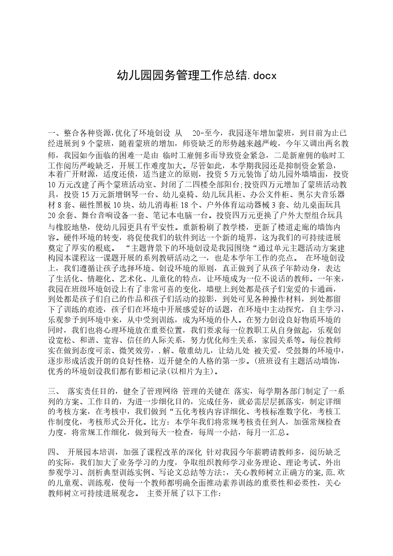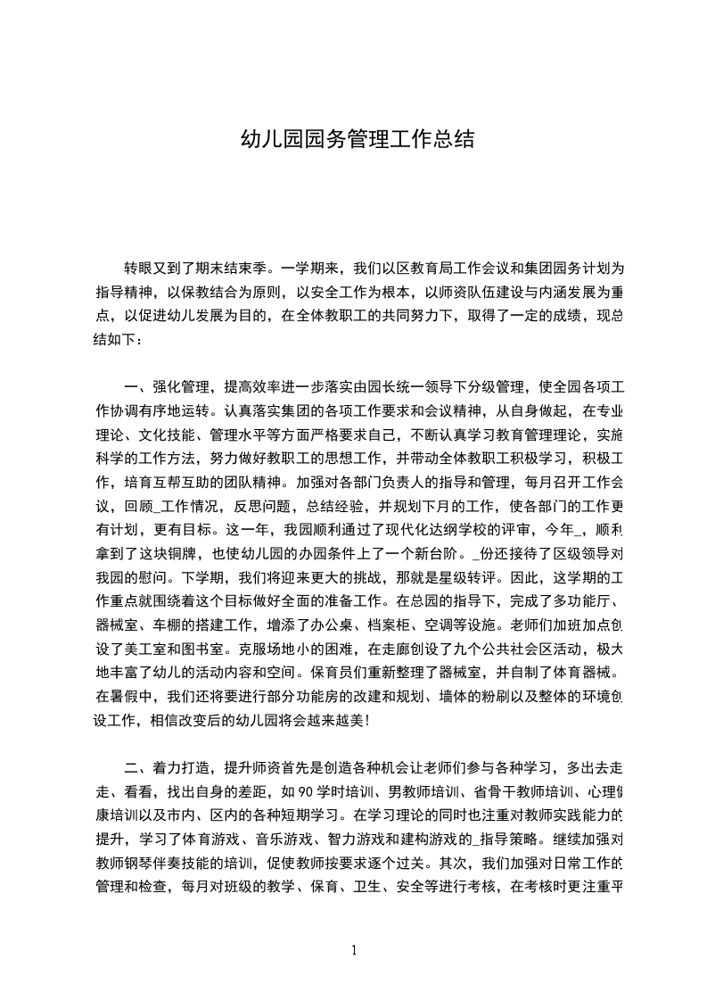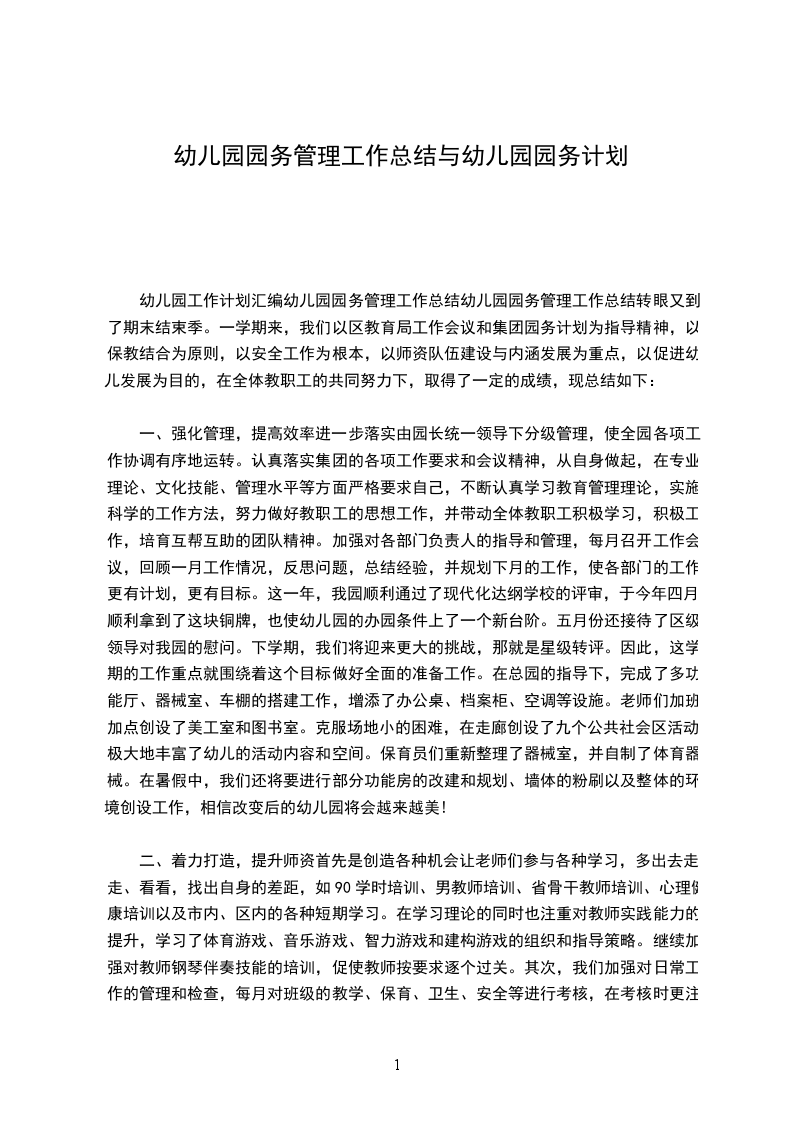 幼儿园工作计划汇编幼儿园园务管理工作总结幼儿园园务管理工作总结转眼又到了期末结束季。一学期来,我们以区教育局工作会议和集团园务计划为指导精神,以保教结合为原则,以安全工作为根本,以师资队伍建设与内涵发展为重点,以促进幼儿发展为目的,在全体教职工的共同努力下,取得了一定的成绩,现总结如下: