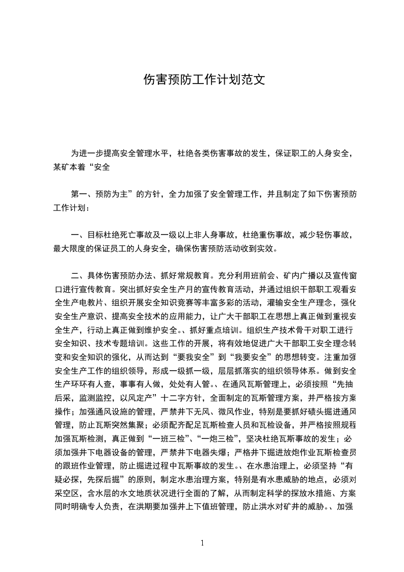 二、具体伤害预防办法、抓好常规教育。充分利用班前会、矿内广播以及宣传窗口进行宣传教育。突出抓好安全生产月的宣传教育活动,并通过组织干部职工观看安全生产电教片、组织开展安全知识竞赛等丰富多彩的活动,灌输安全生产理念,强化安全生产意识、提高安全技术的应用能力,让广大干部职工在思想上真正做到重视安全生产,行动上真正做到维护安全。、抓好重点培训。组织生产技术骨干对职工进行安全知识、技术专题培训。这些工作的开展,将有效地促进广大干部职工安全理念转变和安全知识的强化,从而达到“要我安全”到“我要安全”的思想转变。注重加强安全生产工作的组织领导,形成一级抓一级,层层抓落实的组织领导体系。做到安全生产环环有人查,事事有人做,处处有人管。、在通风瓦斯管理上,必须按照“先抽后采,监测监控,以风定产”十二字方针,全面制定的瓦斯管理方案,并严格按方案操作;加强通风设施的管理,严禁井下无风、微风作业,特别是要抓好碛头掘进通风管理,防止瓦斯突然集聚;必须配齐配足瓦斯检查人员和瓦检设备,并严格按照规程加强瓦斯检测,真正做到“一班三检”、“一炮三检”,坚决杜绝瓦斯事故的发生;必须加强井下电器设备的管理,严禁井下电器失爆;严格井下掘进放炮作业瓦斯检查员的跟班作业管理,防止掘进过程中瓦斯事故的发生。、在水患治理上,必须坚持“有疑必探,先探后掘”的原则,制定水患治理方案,特别是有水患威胁的地点,必须对采空区,含水层的水文地质状况进行全面的了解,从而制定科学的探放水措施、方案。同时明确专人负责,在洪期要加强井上下值班管理,防止洪水对矿井的威胁。、加强劳动保护用品佩带管理工作,佩带劳动保护用品是保护员工,在生产过程中免受伤害的重要手段,各生产单位应大力加强对佩带劳动保护用品的监督检查工作。特别是对粉尘污染严重的场所管理,不仅要采取有效的降尘措施(喷雾降尘、通风降尘、湿式打眼、水炮泥),还要加强对员工佩带防尘口罩的管理工作,对于不佩带防尘口罩的人员严禁上岗,对于电焊工、起重工、锻工等有职业病危害的特殊工种,各单位要严格按照特殊工种职业病预防方法的规定,给员工发放必备的劳动保护用品,单位负责人还要做好佩带监督工作,以预防职业病给员工带来的伤害。、突出安全责任,建立目标管理体系,各单位要做到“横向到边、纵向到底”一层一层地把安全责任分解到个人。一级一级签订安全生产责任书,强化各自岗位的安全责任,形成自我约束、自我完善的工作机制。、要加强组织领导,深入开展事故隐患排查治理工作,做到排查不留死角,整改不留后患,要强化安全生产监管工作,充分发挥综合监管、专业监察在安全生产工作中的作用,要坚持安全生产综合治理的方针,组织和动员全矿各方面力量,加大对隐患排查治理工作的宣传力度,努力创造全员共同参与“治理隐患、防范事故”的氛围。