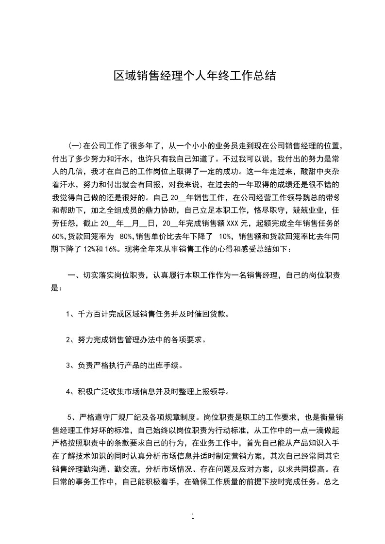 (一)在公司工作了很多年了,从一个小小的业务员走到现在公司销售经理的位置,付出了多少努力和汗水,也许只有我自己知道了。不过我可以说,我付出的努力是常人的几倍,我才在自己的工作岗位上取得了一定的成功。这一年走过来,酸甜中夹杂着汗水,努力和付出就会有回报,对我来说,在过去的一年取得的成绩还是很不错的,我觉得自己做的还是很好的。自己20__年销售工作,在公司经营工作领导魏总的带领和帮助下,加之全组成员的鼎力协助,自己立足本职工作,恪尽职守,兢兢业业,任劳任怨,截止20__年__月__日,20__年完成销售额XXX元,起额完成全年销售任务的60%,货款回笼率为80%,销售单价比去年下降了10%,销售额和货款回笼率比去年同期下降了12%和16%。现将全年来从事销售工作的心得和感受总结如下: