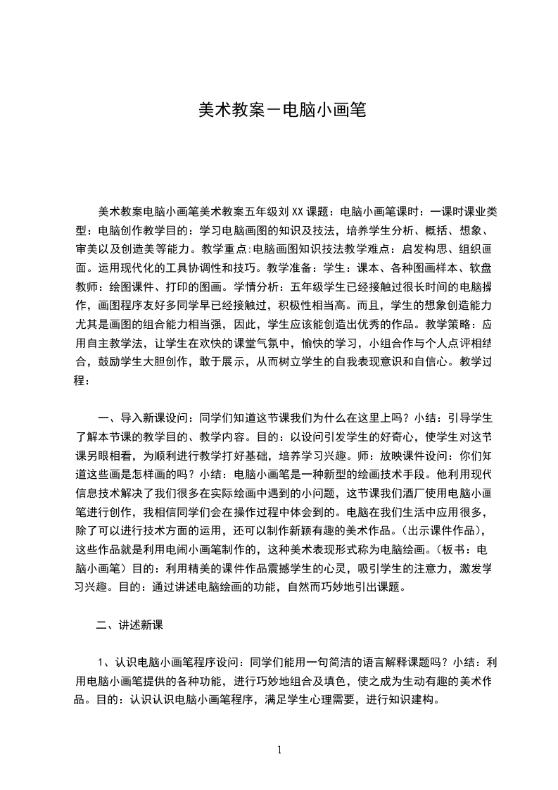 1课时学习领域:综合探索教材分析:新教材中要求鼓励学生进行综合性与探究性的学习,加强美术与其它学科的联系,培养学生的综合思维和综合探究的能力。本课就是将美术与信息技术课进行了整合,引导学生初次接触电脑绘画。教学目标: