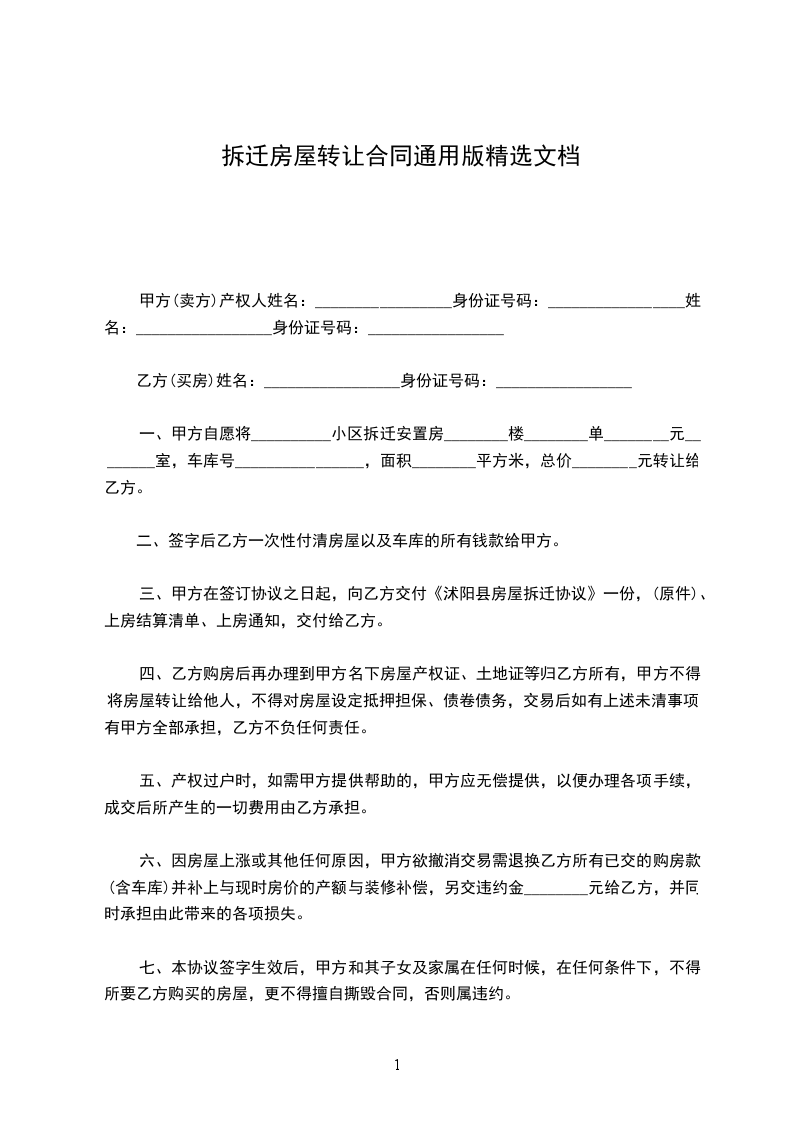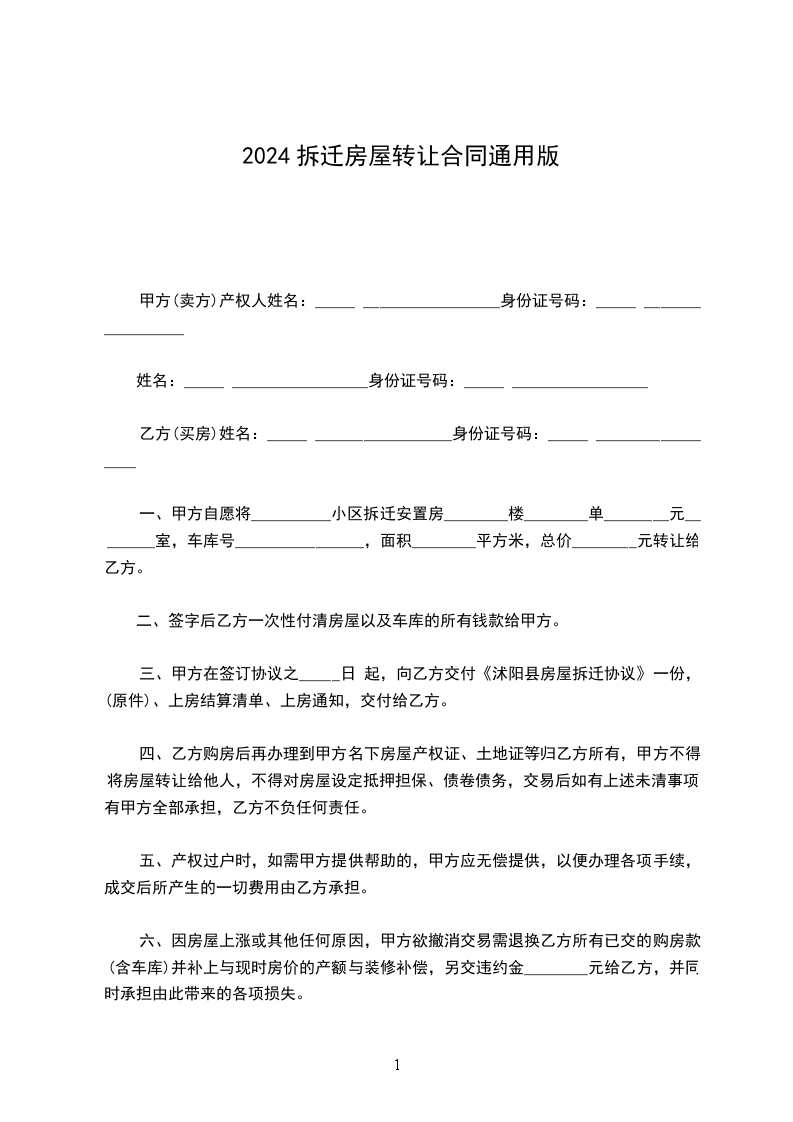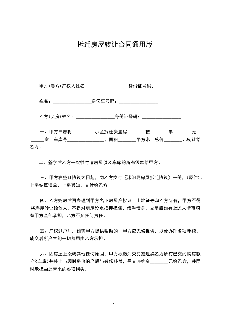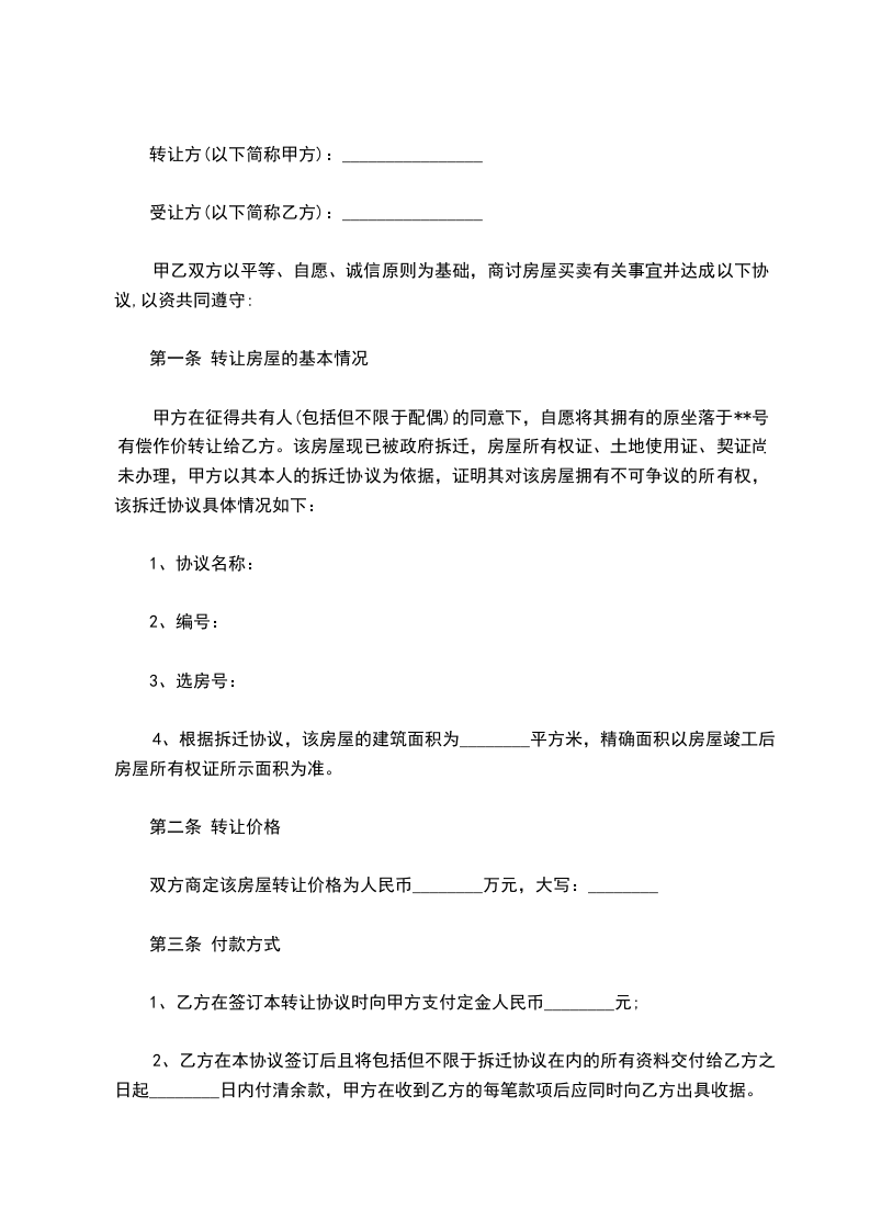 一、甲方自愿将__________小区拆迁安置房________楼________单________元________室,车库号________________,面积________平方米,总价________元转让给乙方。