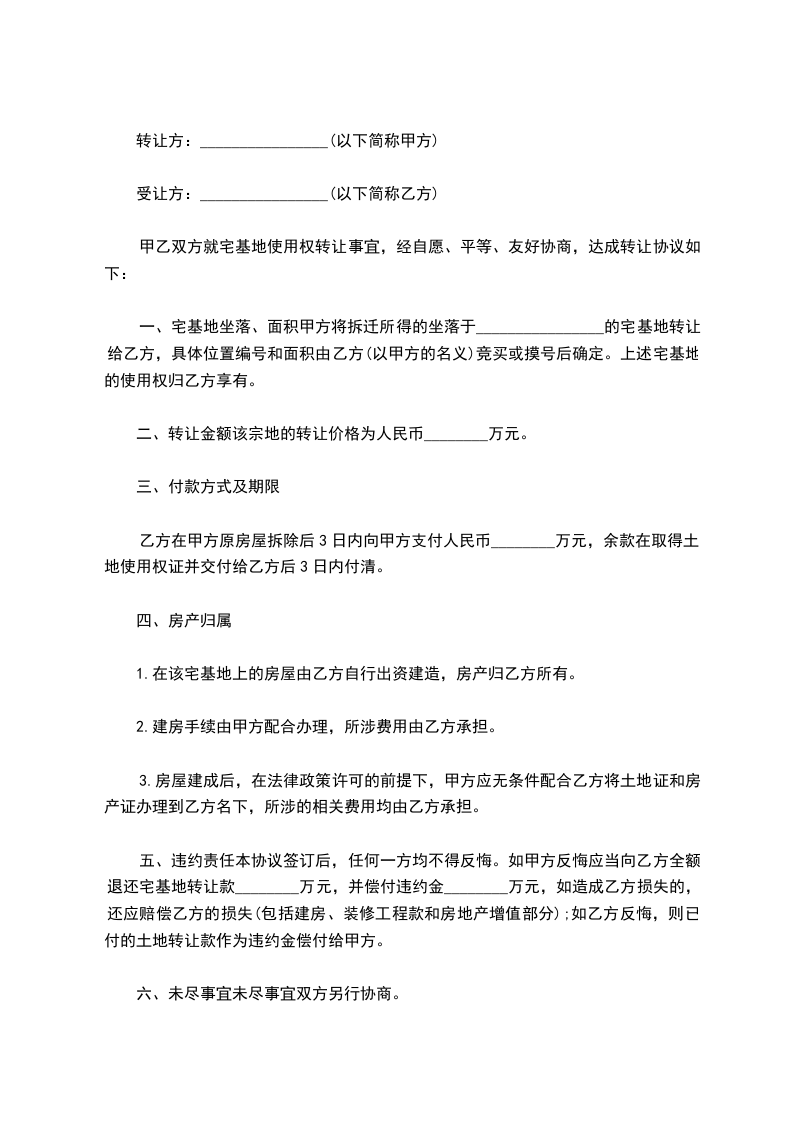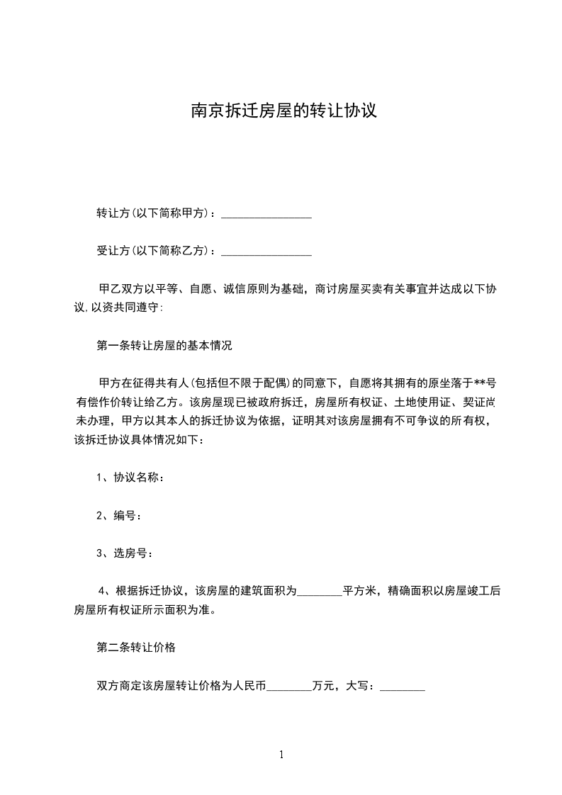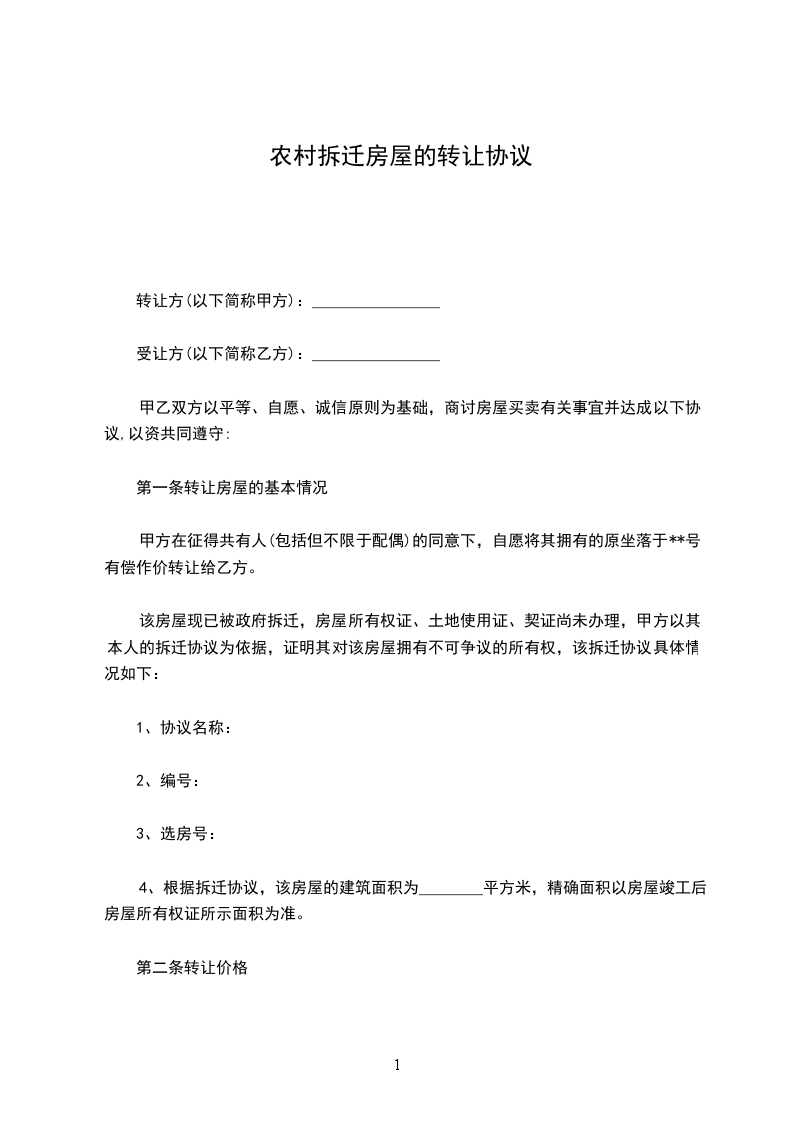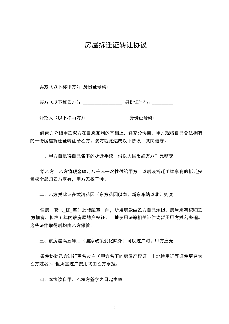 一、甲方自愿将__________小区拆迁安置房________楼________单________元________室,车库号________________,面积________平方米,总价________元转让给乙方。
