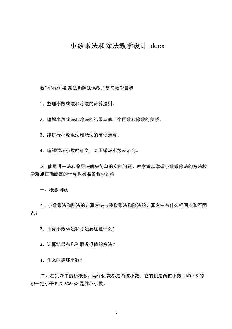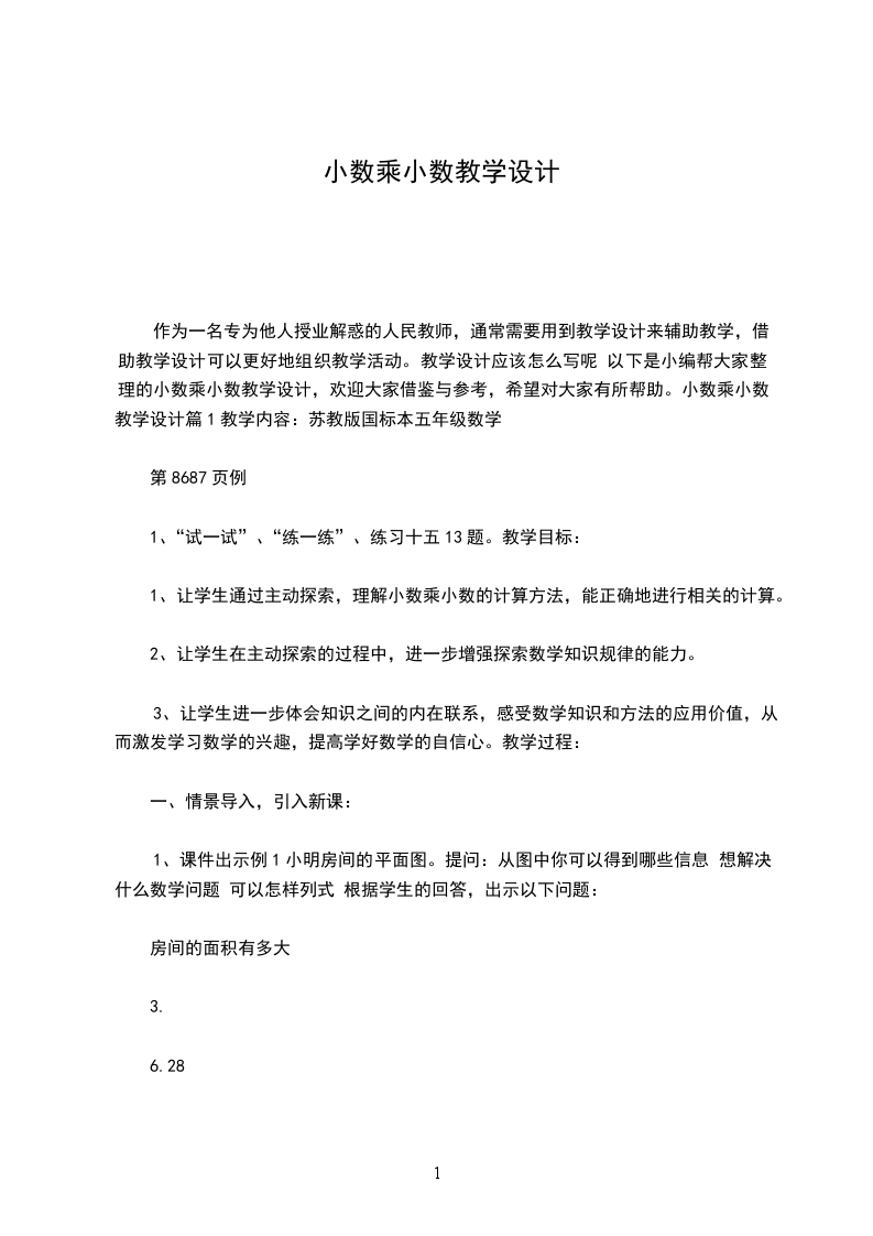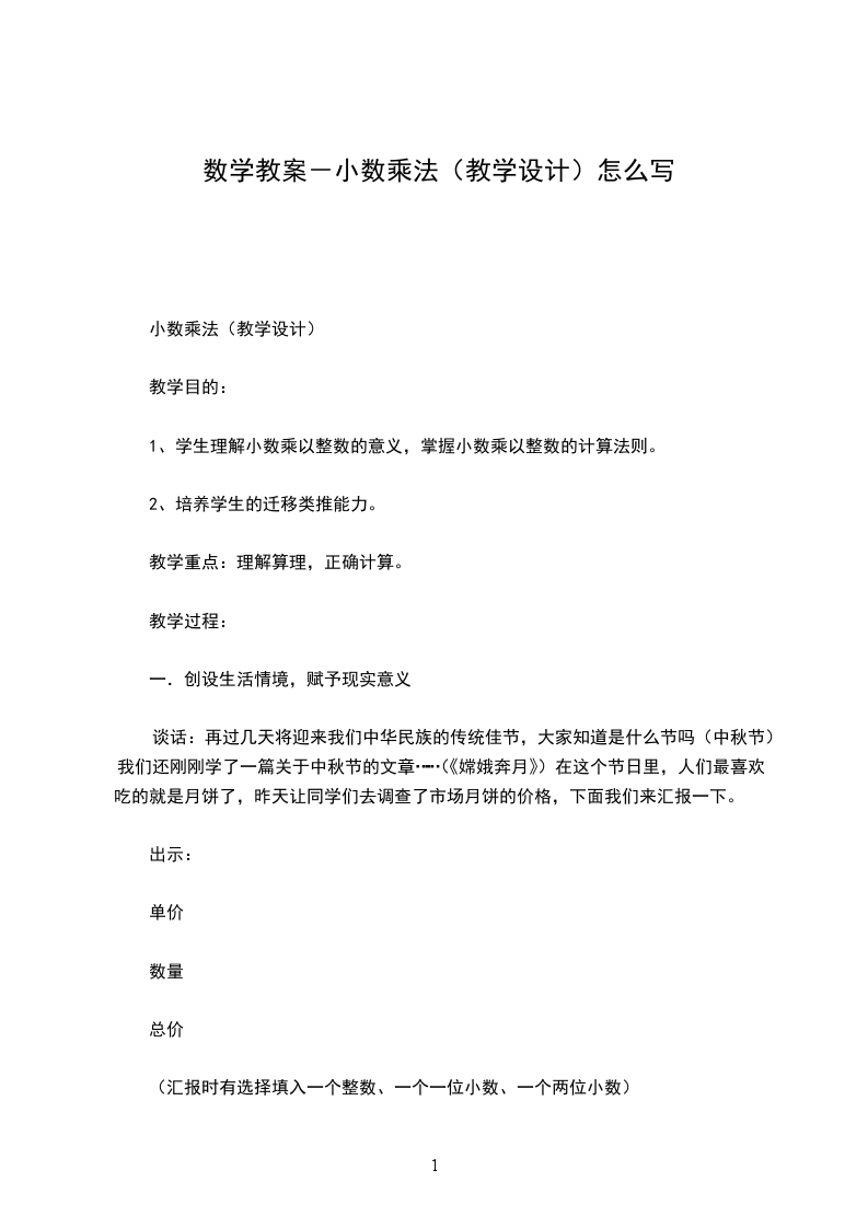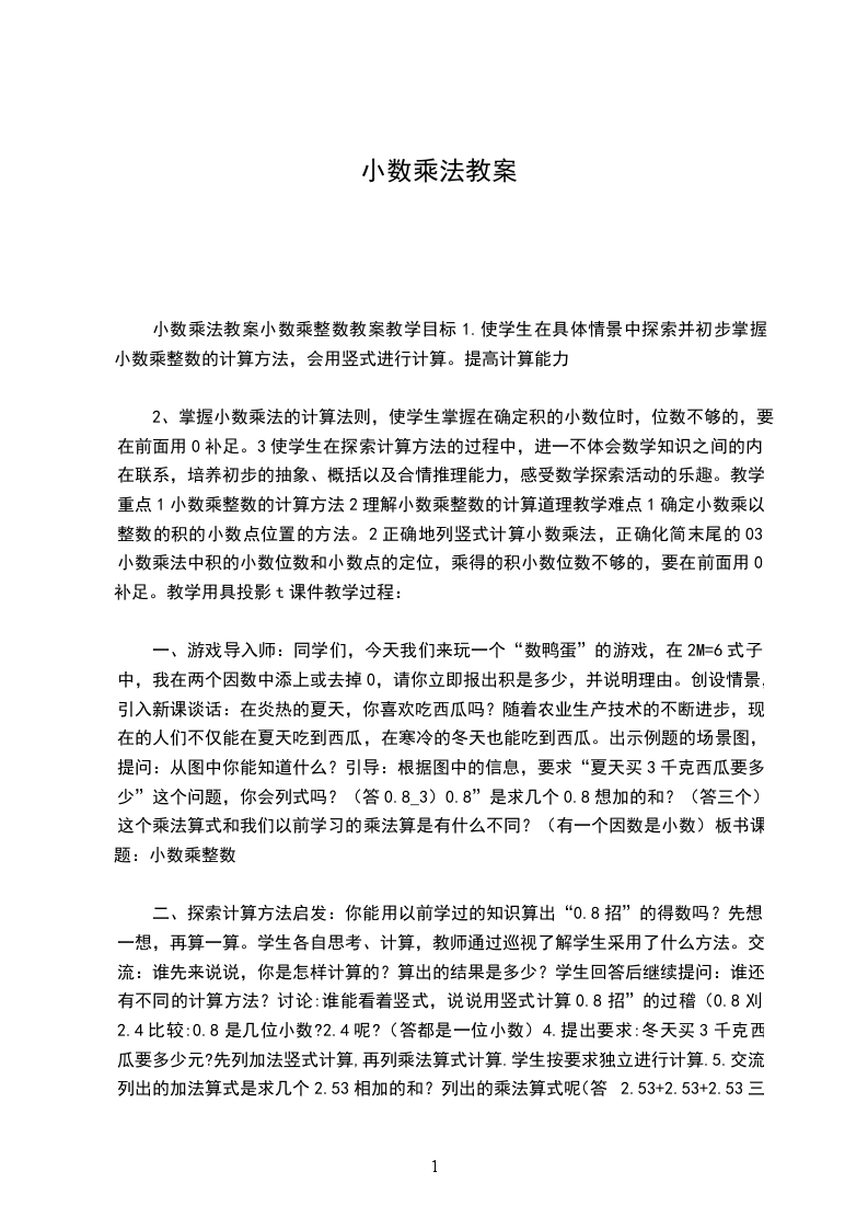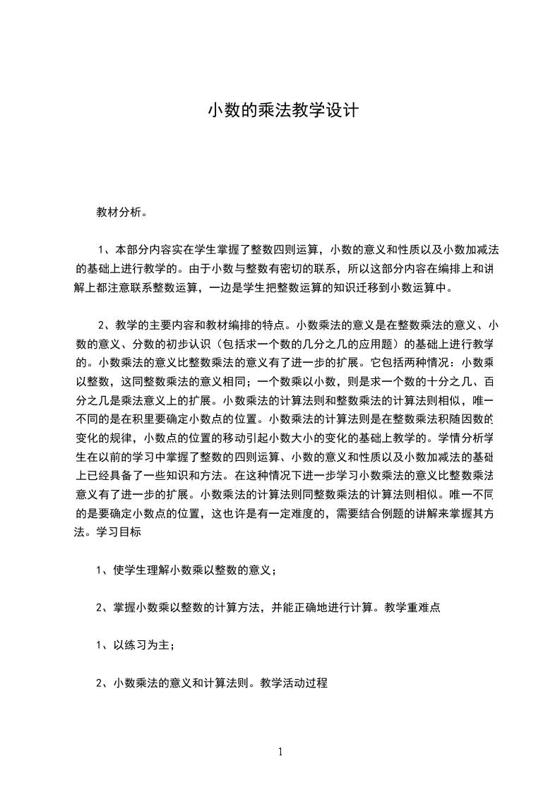 2、教学的主要内容和教材编排的特点。小数乘法的意义是在整数乘法的意义、小数的意义、分数的初步认识(包括求一个数的几分之几的应用题)的基础上进行教学的。小数乘法的意义比整数乘法的意义有了进一步的扩展。它包括两种情况:小数乘以整数,这同整数乘法的意义相同;一个数乘以小数,则是求一个数的十分之几、百分之几是乘法意义上的扩展。小数乘法的计算法则和整数乘法的计算法则相似,唯一不同的是在积里要确定小数点的位置。小数乘法的计算法则是在整数乘法积随因数的变化的规律,小数点的位置的移动引起小数大小的变化的基础上教学的。学情分析学生在以前的学习中掌握了整数的四则运算、小数的意义和性质以及小数加减法的基础上已经具备了一些知识和方法。在这种情况下进一步学习小数乘法的意义比整数乘法意义有了进一步的扩展。小数乘法的计算法则同整数乘法的计算法则相似。唯一不同的是要确定小数点的位置,这也许是有一定难度的,需要结合例题的讲解来掌握其方法。学习目标