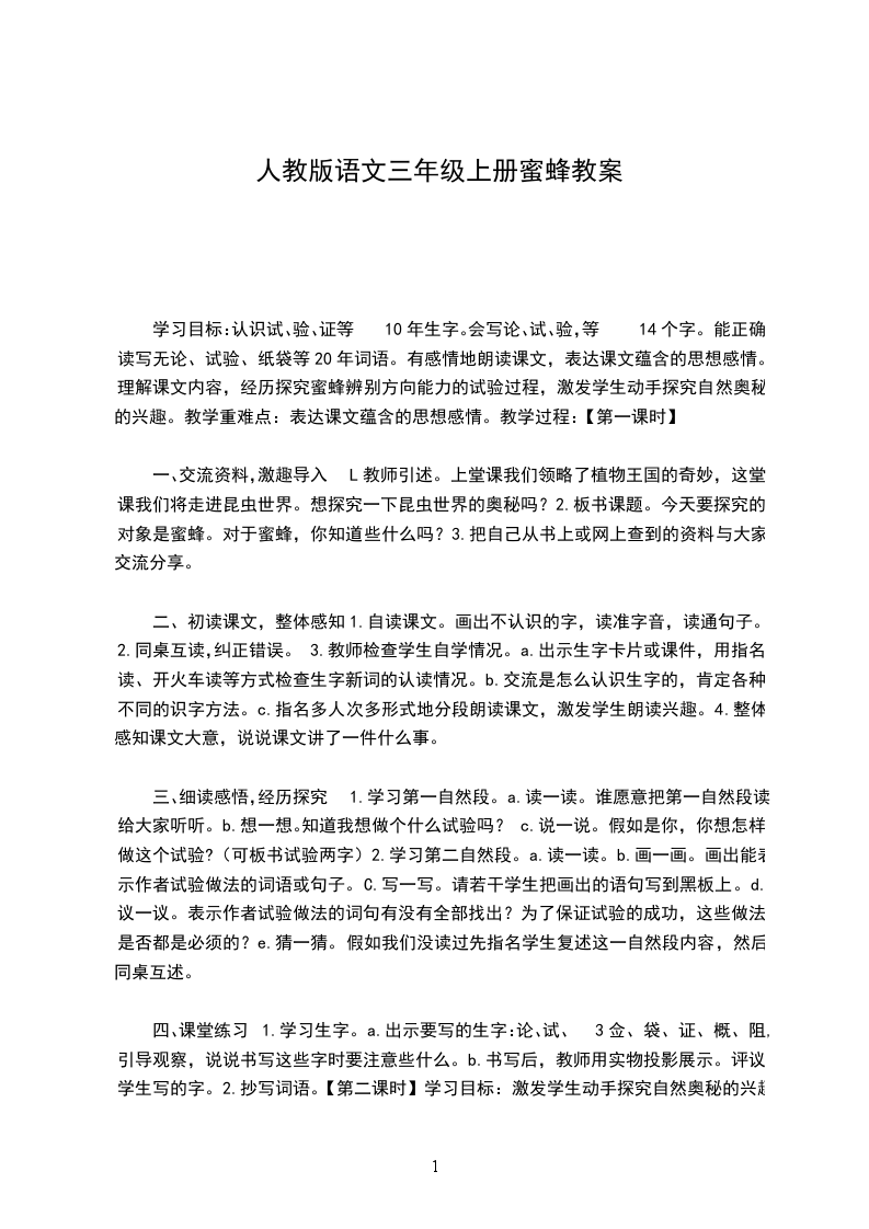 四、课堂练习1.学习生字。a.出示要写的生字:论、试、3佥、袋、证、概、阻,引导观察,说说书写这些字时要注意些什么。b.书写后,教师用实物投影展示。评议学生写的字。2.抄写词语。【第二课时】学习目标:激发学生动手探究自然奥秘的兴趣。理解内容,经历探究蜜蜂辨别方向能力的试验过程。通过资料,进一步了解有关蜜蜂的知识。教学重难点:理解内容,经历探究蜜蜂辨别方向能力的试验过程。教学过程: