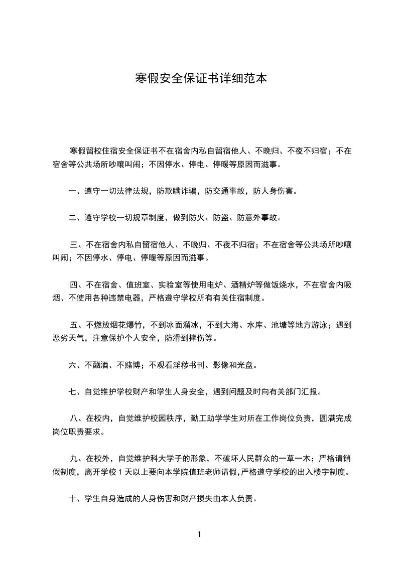 寒假留校住宿安全保证书不在宿舍内私自留宿他人、不晚归、不夜不归宿;不在宿舍等公共场所吵嚷叫闹;不因停水、停电、停暖等原因而滋事。