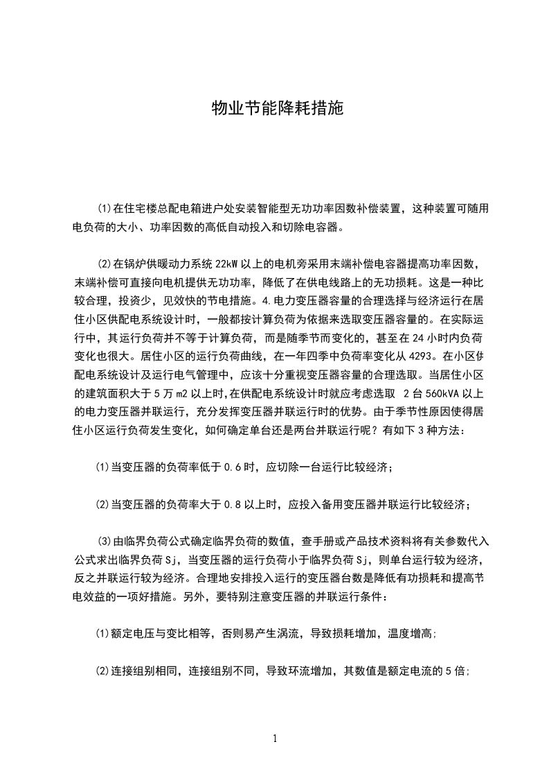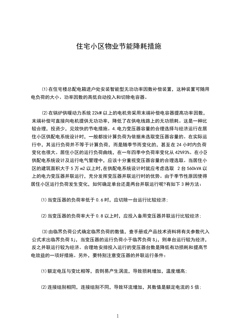 (3)阻抗电压Ud相等,以利于均等发挥并联运行时的供电能力。5.电机节电居住小区内一般都有数量较多的电机,除了锅炉供暖系统的热水循环泵、引风、鼓风电机、炉排传动电机、电葫芦电机、输送带电机外,还有电梯曳引电机、高压水泵电机等。要特别重视中小型电机的节电。这些电机大多属于风机,水泵类负荷,应采用变频调速技术。我朋友以前所在的物业管理公司管理的居住小区,电机总装机容量1200kW,计划在3年5年内逐步改造,更换为变频调速和高效能电机。目前,已采用变频调速的电机容量335kW,运转时每小时节电可达33KWh,一个供暖季可节电8万kWh,折合4.6万元。只需三个供暖季运行即可收回投资。另外,其它节电途径还有按经济运行选择合适的电机容量,减少轻载和空载运行时间,保证电机的电源电压基本正常等措施。6.照明灯具的节电选用高效光源和节能型灯具。以往大多数居住小区在设计时,路灯,公共场所等夜间照明采用的是白炽灯、水银灯,应改造成为紧凑型荧光灯,可节电50左右。办公、商业楼照明的老式灯具应改造成带电子镇流器和细管径灯管的节能型荧光灯,节电15以上,还能延长灯管的使用寿命约60,光效高达50,消除了频闪效应和噪声。采用节能型荧光灯具运行2年即可收回投资。优化照明设计和管理。在居住小区照明设计中,除住户照明外,应对居住小区的道路、公共场所、办公、商业楼等不同的区域采用不同的照度标准。合理配光,采用节能要求的控制方法,尽量利用天然光束减少照明,实现时间、地点、天气变化、工作和生活需要灵活地调节照度水平。采用智能化照明管理系统,不仅节电,还能使小区由亮变“靓”,当人们进入小区后,“靓”感给人们的心理和生活极佳的影响。7.结束语小区物业的节电是物业管理工作的重要组成部分,它投资少,见效快,周期短,效益高。实施后可显著地降低物业管理公司的运行成本。总之,小区物业的节电潜力很大,全国几万多家物业管理企业如能采用1项2项节电措施,其节电效果和经济效益将是巨大的!尊敬的物业管理同行们,节能降耗、开源节流从我们开始,从现在开始。你真诚挚友好的管理同行