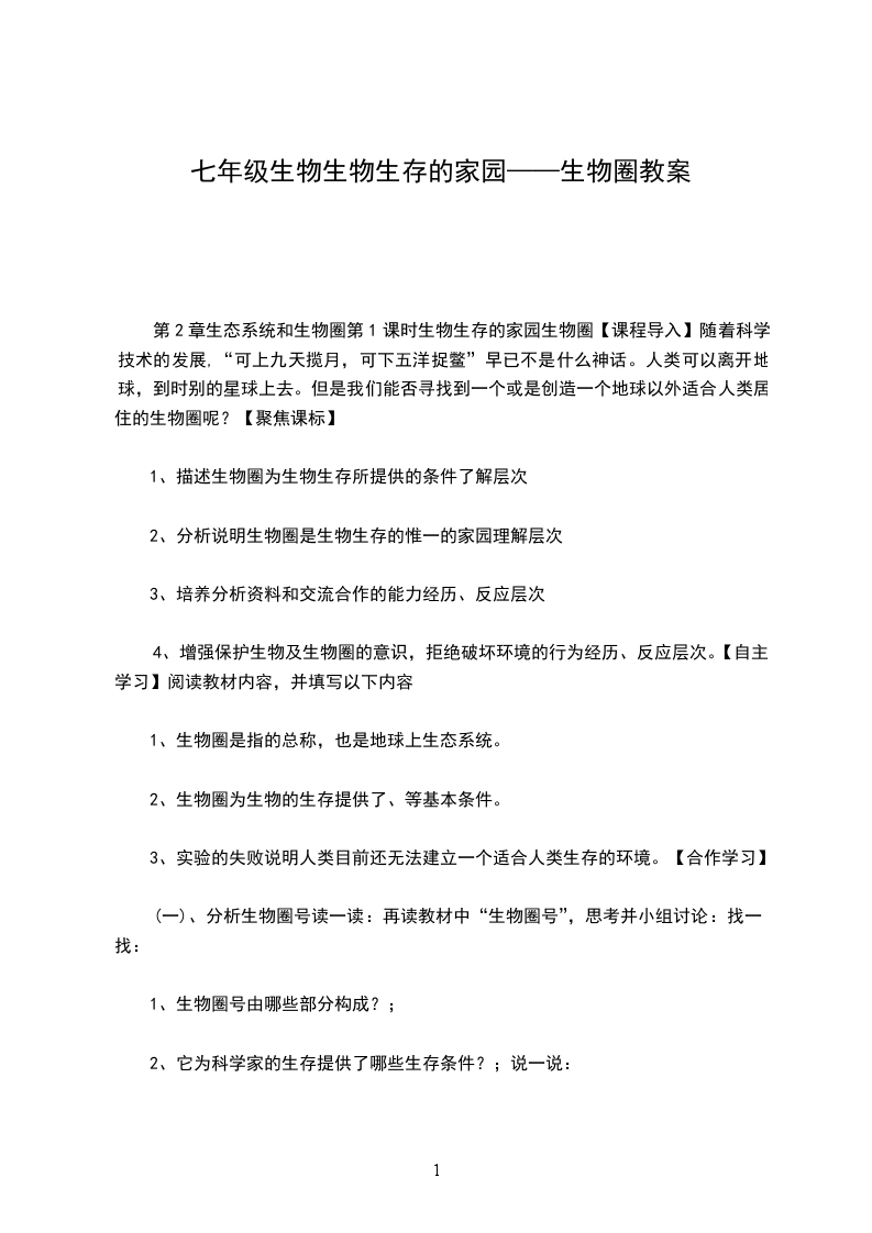 (一)、分析生物圈号读一读:再读教材中“生物圈号”,思考并小组讨论:找一找:
