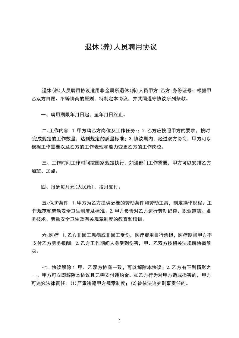 甲方因工作需要,需聘用乙方。鉴于乙方已退休性质,不具备劳动法律关系的主体资格。根据《民法典》和有关规定,现经协商一致,特签订本协议,以便共同遵守执行。