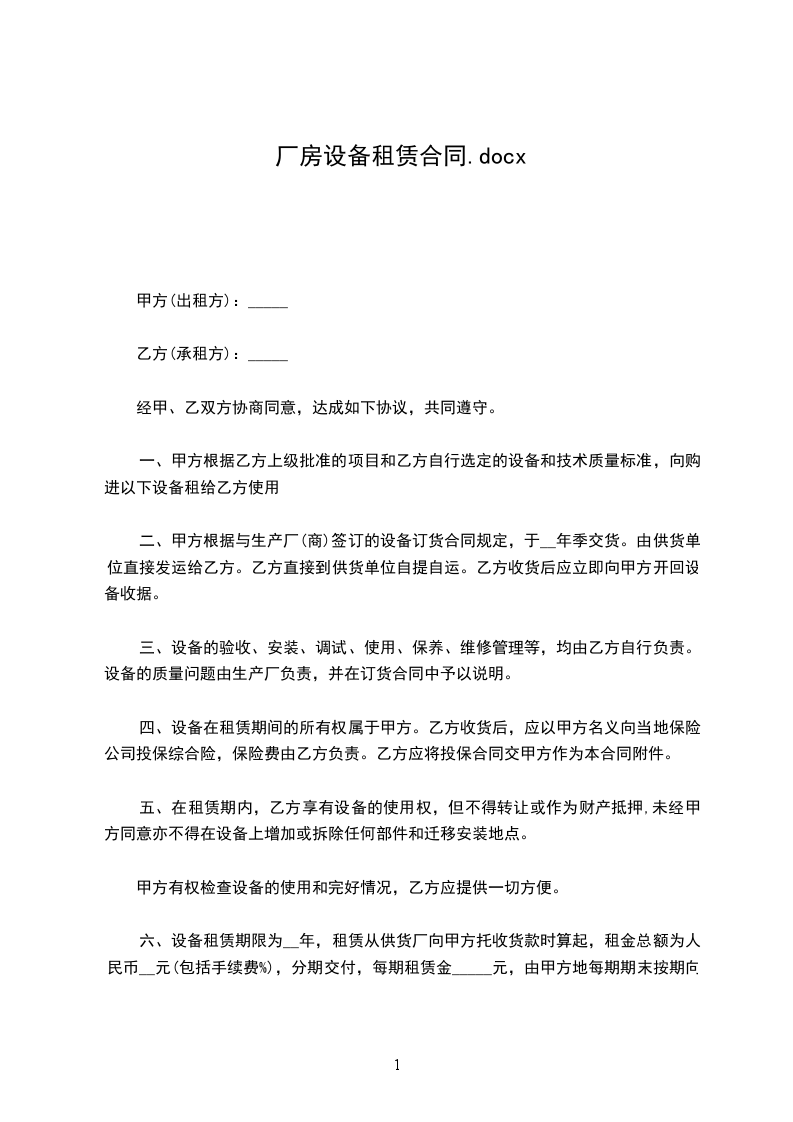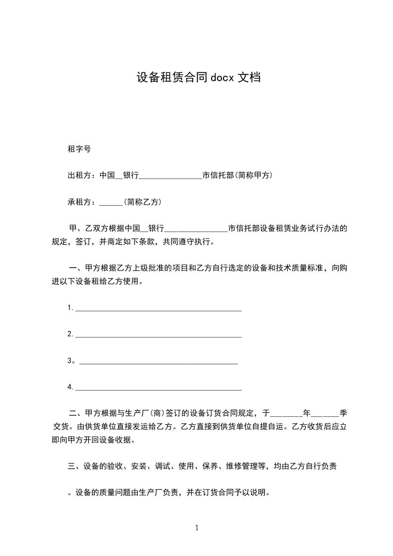 (一)、甲方根据乙方上级批准的项目和乙方自行选定的设备和技术质量标准,向_购进以下设备租给乙方使用。_