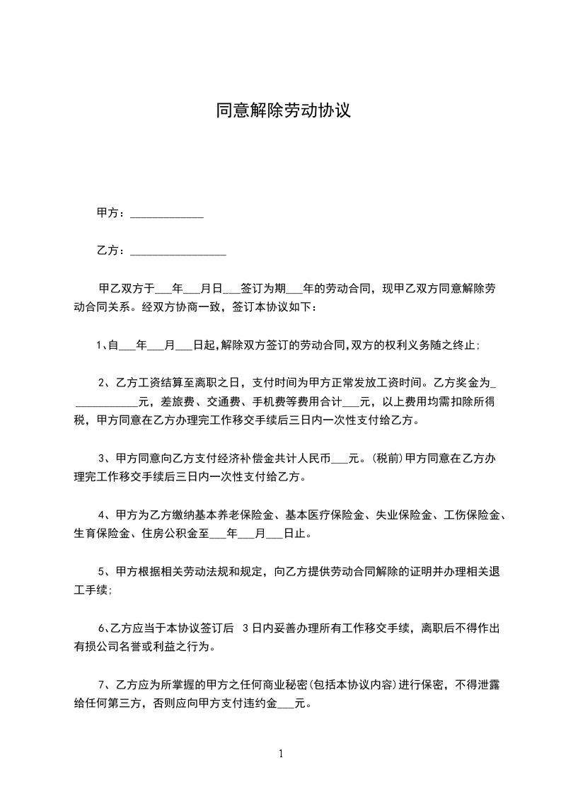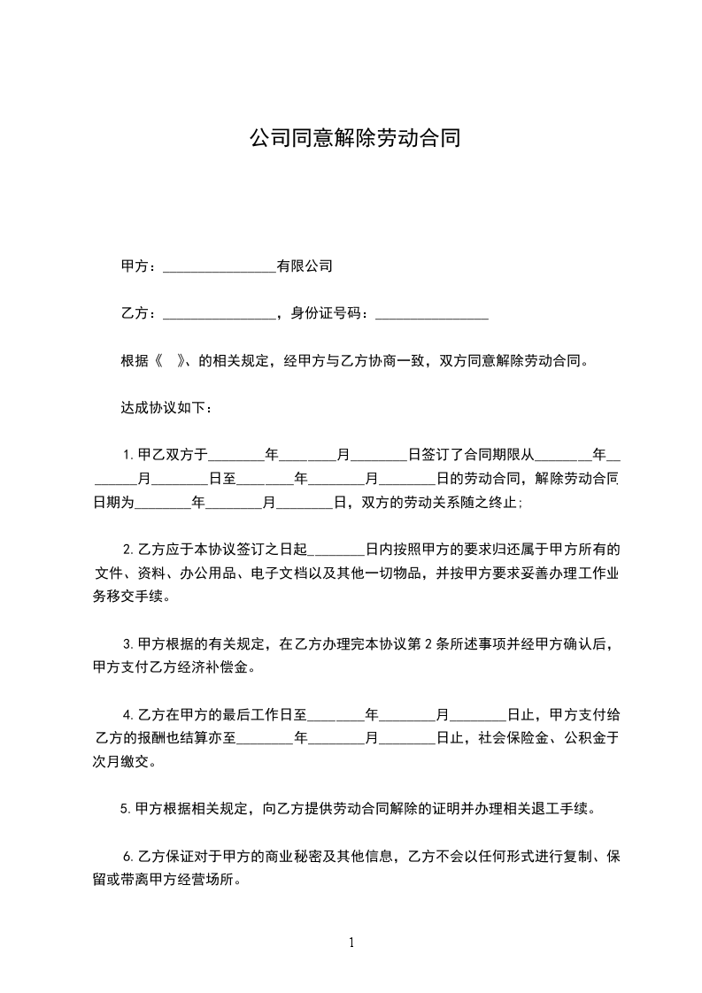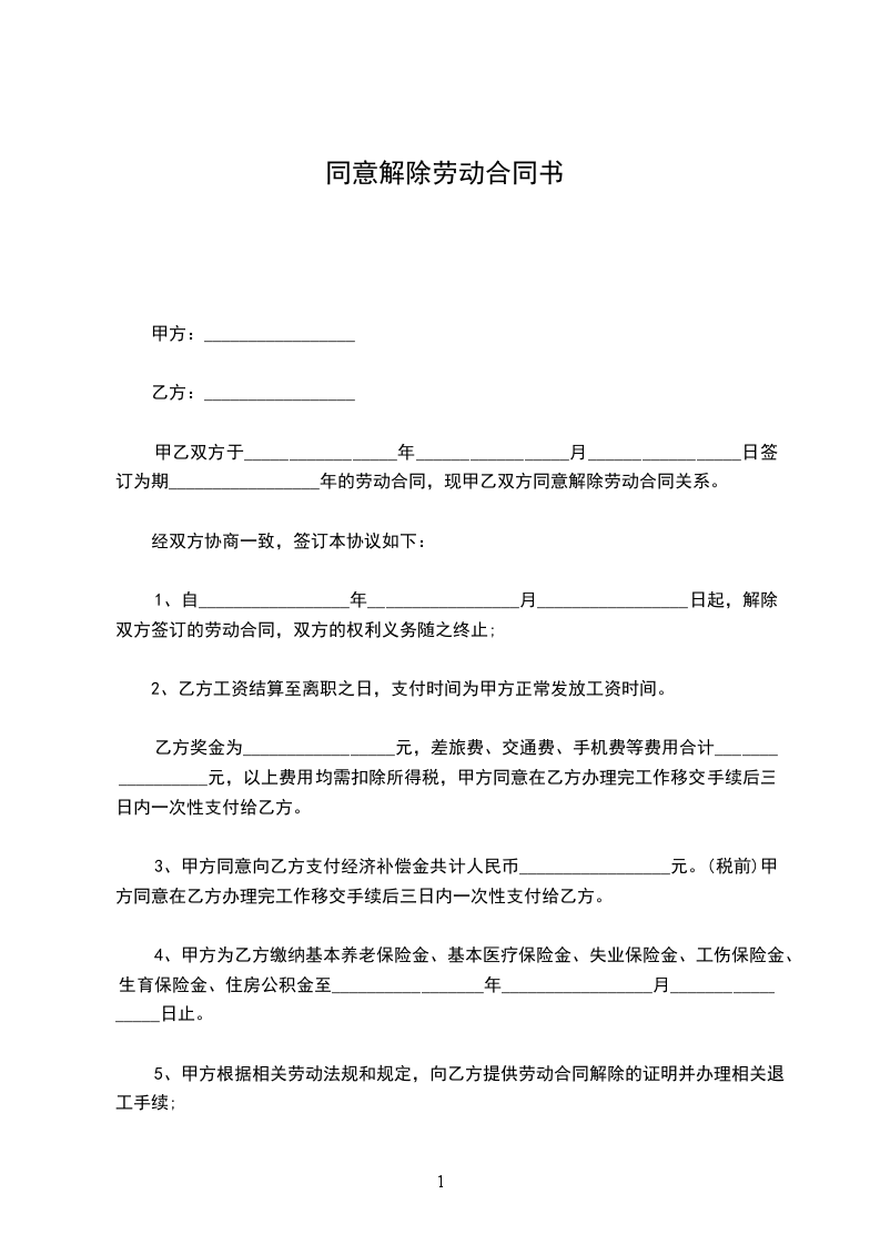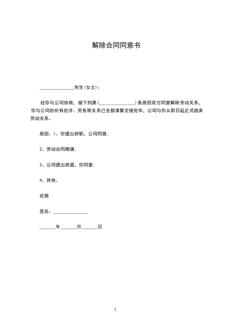 经你与公司协商,据下列第(_______________)条原因双方同意解除劳动关系,你与公司的所有经济、劳务等关系已全部清算交接完毕,公司与你从即日起正式脱离劳动关系。