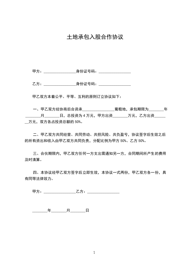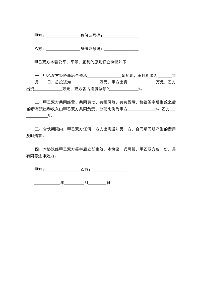 一、甲乙双方经协商后合资承_________________葡萄地,承包期限为________年________月________日,总投资为___万元,甲方出资________万元,乙方出资________万元,双方各占投资总额的___%。