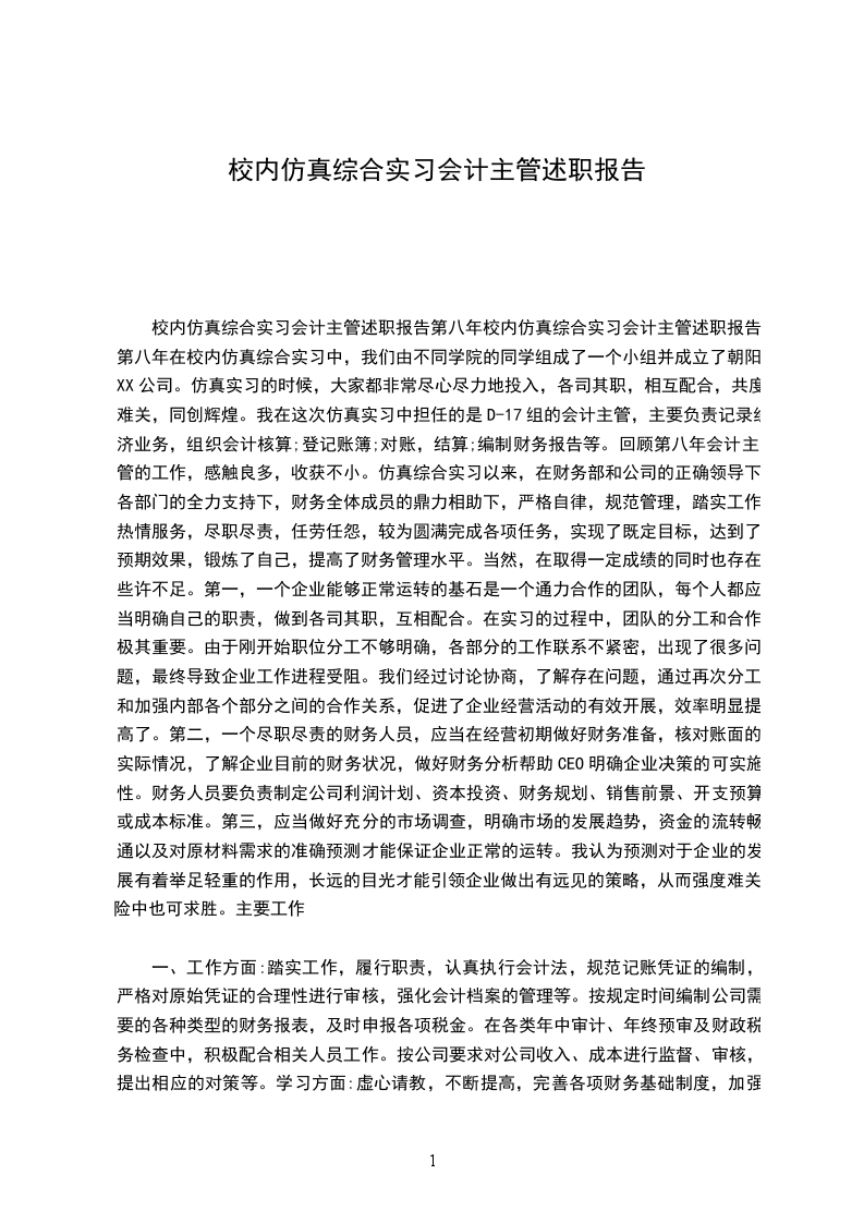校内仿真综合实习会计主管述职报告第八年校内仿真综合实习会计主管述职报告第八年在校内仿真综合实习中,我们由不同学院的同学组成了一个小组并成立了朝阳XX公司。仿真实习的时候,大家都非常尽心尽力地投入,各司其职,相互配合,共度难关,同创辉煌。我在这次仿真实习中担任的是D-17组的会计主管,主要负责记录经济业务,组织会计核算;登记账簿;对账,结算;编制财务报告等。回顾第八年会计主管的工作,感触良多,收获不小。仿真综合实习以来,在财务部和公司的正确领导下,各部门的全力支持下,财务全体成员的鼎力相助下,严格自律,规范管理,踏实工作,热情服务,尽职尽责,任劳任怨,较为圆满完成各项任务,实现了既定目标,达到了预期效果,锻炼了自己,提高了财务管理水平。当然,在取得一定成绩的同时也存在些许不足。第一,一个企业能够正常运转的基石是一个通力合作的团队,每个人都应当明确自己的职责,做到各司其职,互相配合。在实习的过程中,团队的分工和合作极其重要。由于刚开始职位分工不够明确,各部分的工作联系不紧密,出现了很多问题,最终导致企业工作进程受阻。我们经过讨论协商,了解存在问题,通过再次分工和加强内部各个部分之间的合作关系,促进了企业经营活动的有效开展,效率明显提高了。第二,一个尽职尽责的财务人员,应当在经营初期做好财务准备,核对账面的实际情况,了解企业目前的财务状况,做好财务分析帮助CEO明确企业决策的可实施性。财务人员要负责制定公司利润计划、资本投资、财务规划、销售前景、开支预算或成本标准。第三,应当做好充分的市场调查,明确市场的发展趋势,资金的流转畅通以及对原材料需求的准确预测才能保证企业正常的运转。我认为预测对于企业的发展有着举足轻重的作用,长远的目光才能引领企业做出有远见的策略,从而强度难关,险中也可求胜。主要工作