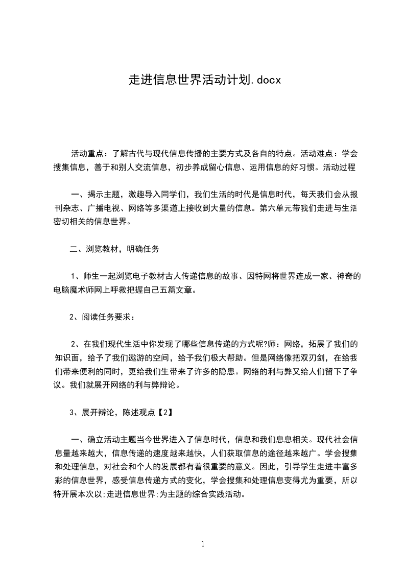 活动重点:了解古代与现代信息传播的主要方式及各自的特点。活动难点:学会搜集信息,善于和别人交流信息,初步养成留心信息、运用信息的好习惯。活动过程: