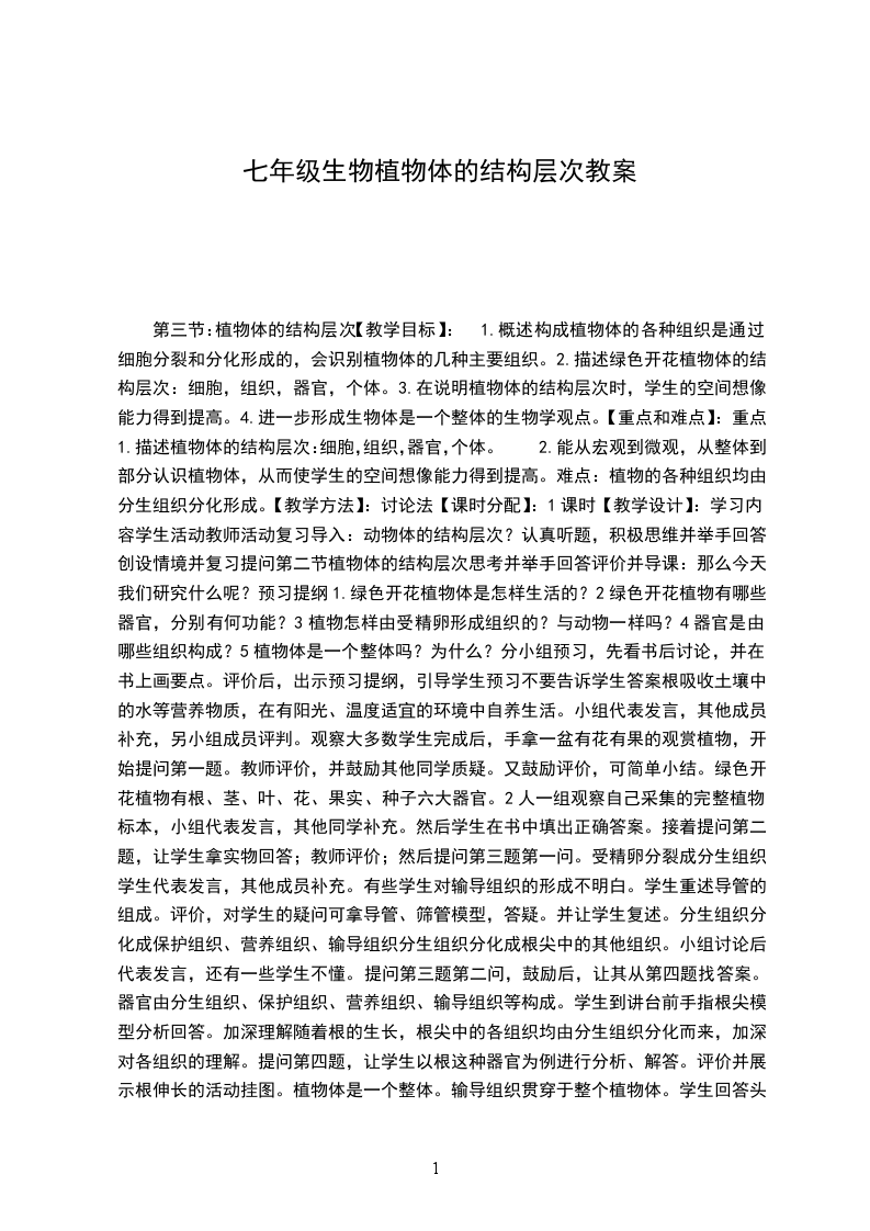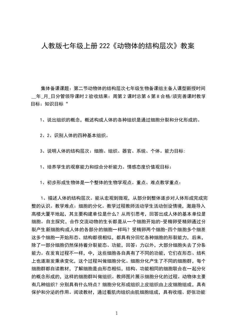 第二章第二节动物体的结构层次课型新授课(研讨课)教学目标过程与方法:通过引导探究,使学生明确细胞分化、组织、器官、系统等概念,以及人体的结构层次。知识与技能:说出组织的概念,概述构成人体的各种组织是通过细胞分裂和分化形成的识别人体的四种基本组织;说明人体的结构层次;细胞、组织、器官、系统、个体。情感态度价值观:
