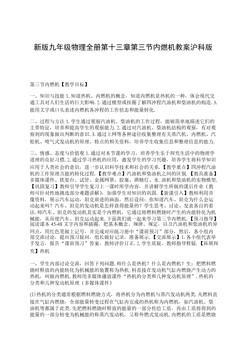 三、情感、态度与价值观1.通过对本节课的学习,培养学生乐于探究生活中的物理学道理的良好习惯.2.通过学习热机的应用,激发学生的学习兴趣,培养学生将科学知识应用于人类社会的意识,进一步认识科学技术和社会的关系.【教学重点】四冲程汽油机的工作原理及能的转化过程.【教学难点】汽油机和柴油机之间的区别.【教具准备】多媒体课件、铁架台、试管、金属网罩、胶塞、酒精灯、水;油机和柴油机的实物模型.【巩固复习】教师引导学生复习上一课时所学内容,并讲解学生所做的课后作业(教师可针对性地挑选部分难题讲解),加强学生对知识的巩固.【新课引入】教师利用音像资料,展示汽车运动,坦克前进的画面,然后设问:你知道汽车、坦克为什么会运动起来吗?汽车、坦克的发动机是怎样获得能量的?学生思考、讨论、发表各自的看法.师汽车、坦克的发动机其实是个内燃机,它通过将燃料燃烧时产生的内能转化为机械能,从而使汽车、坦克运动起来.下面我们就一起来学习第三节内燃机.【预习指导】阅读课本45-48文字内容和插图,把基本概念、规律、规定,以及汽油机和柴油机的异同点,用红色笔做上记号,并完成对应练习册中“课前预习”部分,然后,各小组内部交流讨论,提出预习疑问,组长做好记录,准备展示.【交流展示】1.各小组代表举手发言,报告“课前预习”答案,教师评价订正.2.学生质疑,教师指导释疑.【拓展探究】热机