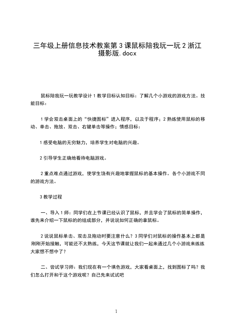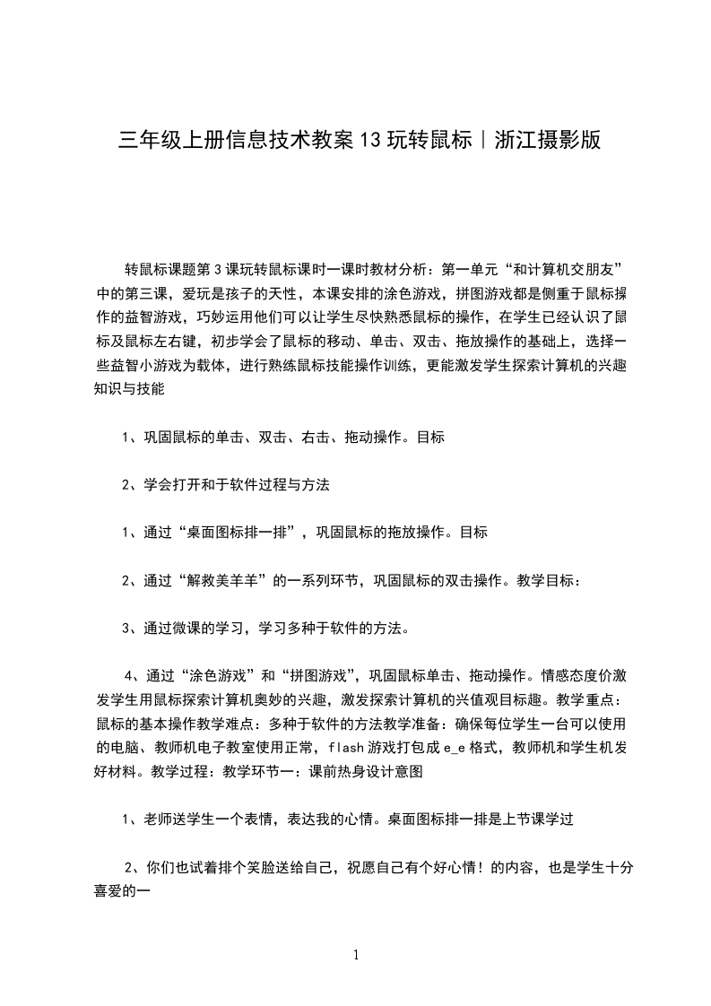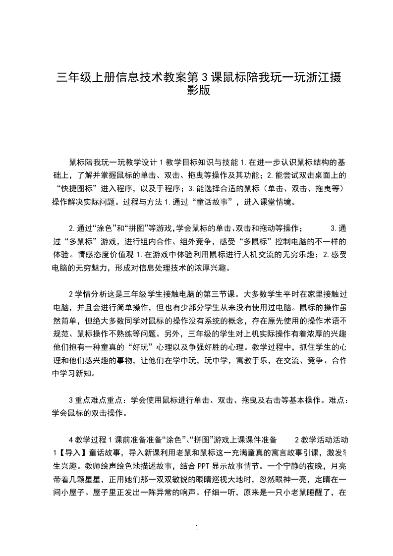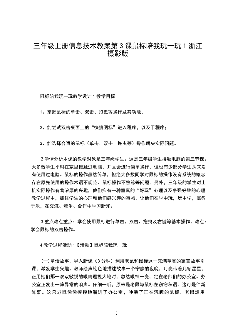 2重点难点教学重点:鼠标的指向、单击、双击、拖动教学难点:鼠标的双击操作3教学过程活动1【导入】可爱的鼠标