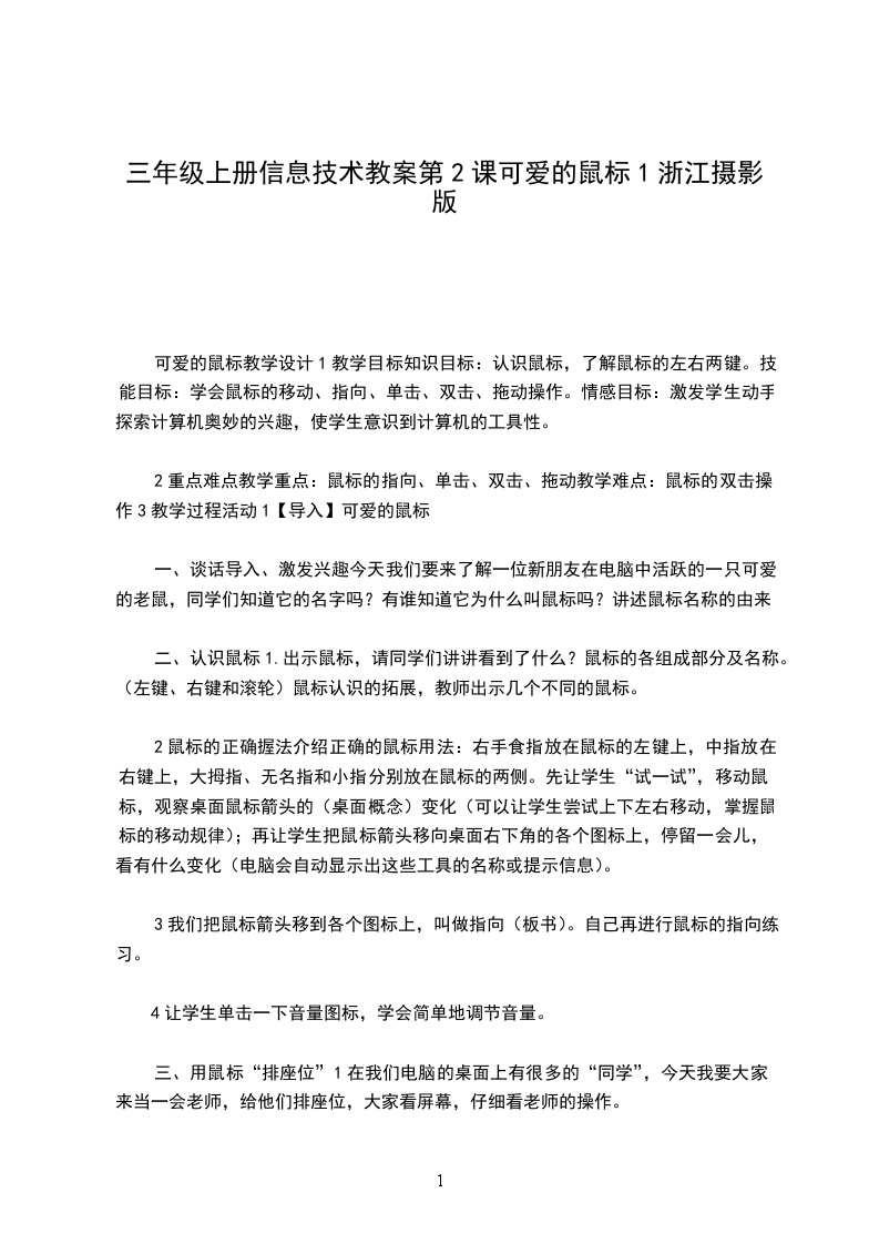 可爱的鼠标教学设计1教学目标知识目标:认识鼠标,了解鼠标的左右两键。技能目标:学会鼠标的移动、指向、单击、双击、拖动操作。情感目标:激发学生动手探索计算机奥妙的兴趣,使学生意识到计算机的工具性。